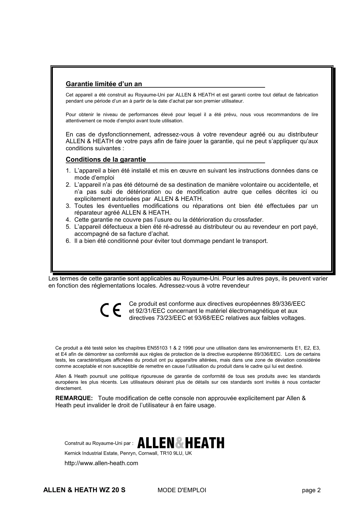 Allen & Heath poursuit une politique rigoureuse de garantie de conformite de tous ses produits avec les standards europeens les plus recents. Les utilisateurs désirant plus de détails sur ces standards sont invitees à nous contacter directement.