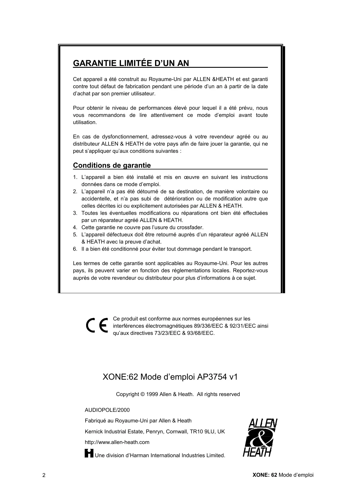 Cet apparéil a été construit au Royaume-Uni par ALLEN &HEATH et est garantie contre tout défaut de fabrication pendant une période d'un an à partir de la date d'achat par son premier utilisateur.