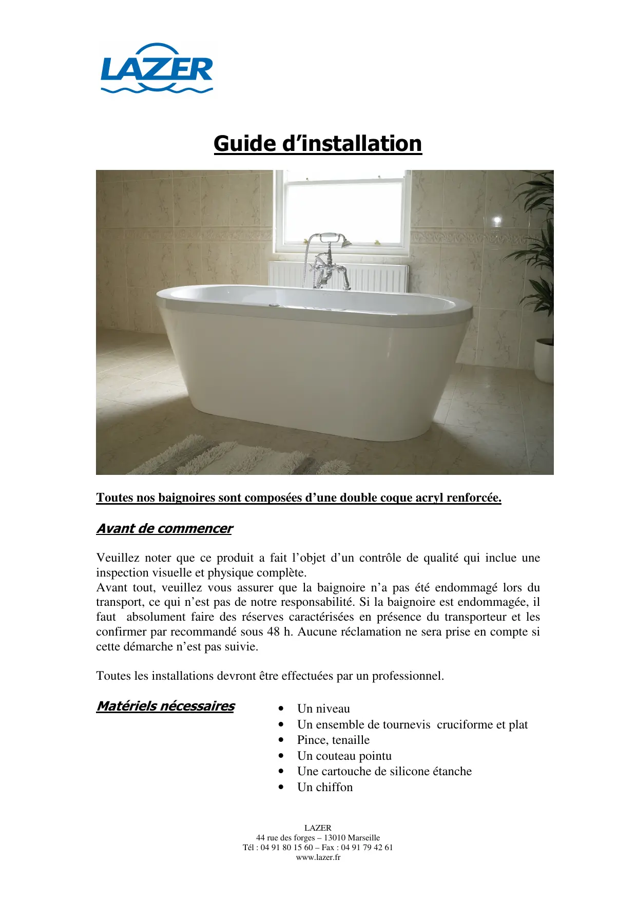 Avant tout, veuillez vous assurer que la baignoire n'a pas ete endommagé lors du transport, ce qui n'est pas de notre responsabilité. Si la baignoire est endommagée, il faut absolument faire des réserves caractérisées en presence du transporteur et les confirmer par recommendé sous 48 h. Aucune réclamation ne sera prise en compte si cette démarche n'est pas suivie.