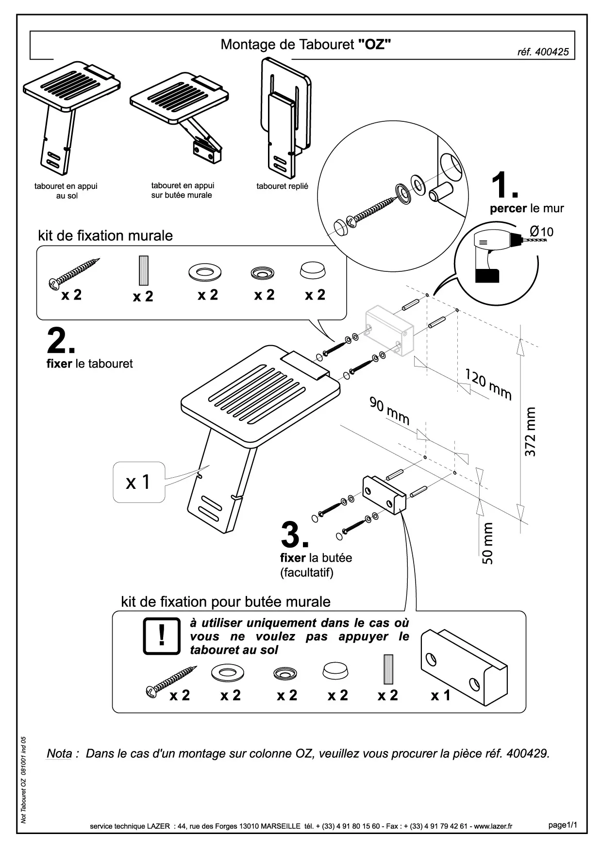 Nota : Dans le cas d'un montage sur colonne OZ, veuillesz vous procurer la piece ref. 400429.
