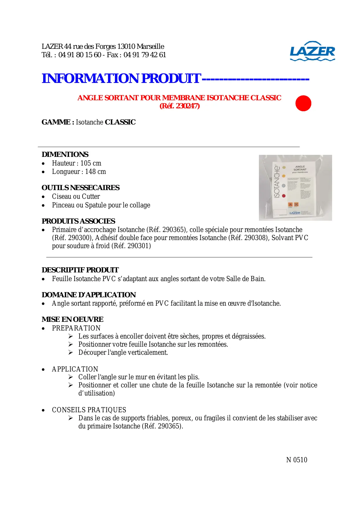 CONSEILS PRATIQUES Dans le cas de supports friables, poreux, ou fragiles il convient de les stabiliser avec du primaire Isotanche (Réf. 290365). N 0510