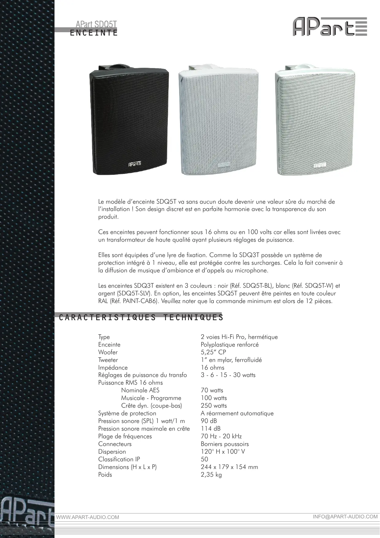 Elles sont équipées d’une lyre de fixation. Comme la SDQ3T possède un système de protection intégré à 1 niveau, elle est protégée contre les surcharges. Cela la fait convenir à la diffusion de musique d’ambiance et d’appels au microphone. Les enceintes SDQ3T existent en 3 couleurs : noir (Réf. SDQ5T-BL), blanc (Réf. SDQ5T-W) et argent (SDQ5T-SLV). En option, les enceintes SDQ5T peuvent être peintes en toute couleur RAL (Réf. PAINT-CAB6). Veuillez noter que la commande minimum est alors de 12 pièces.