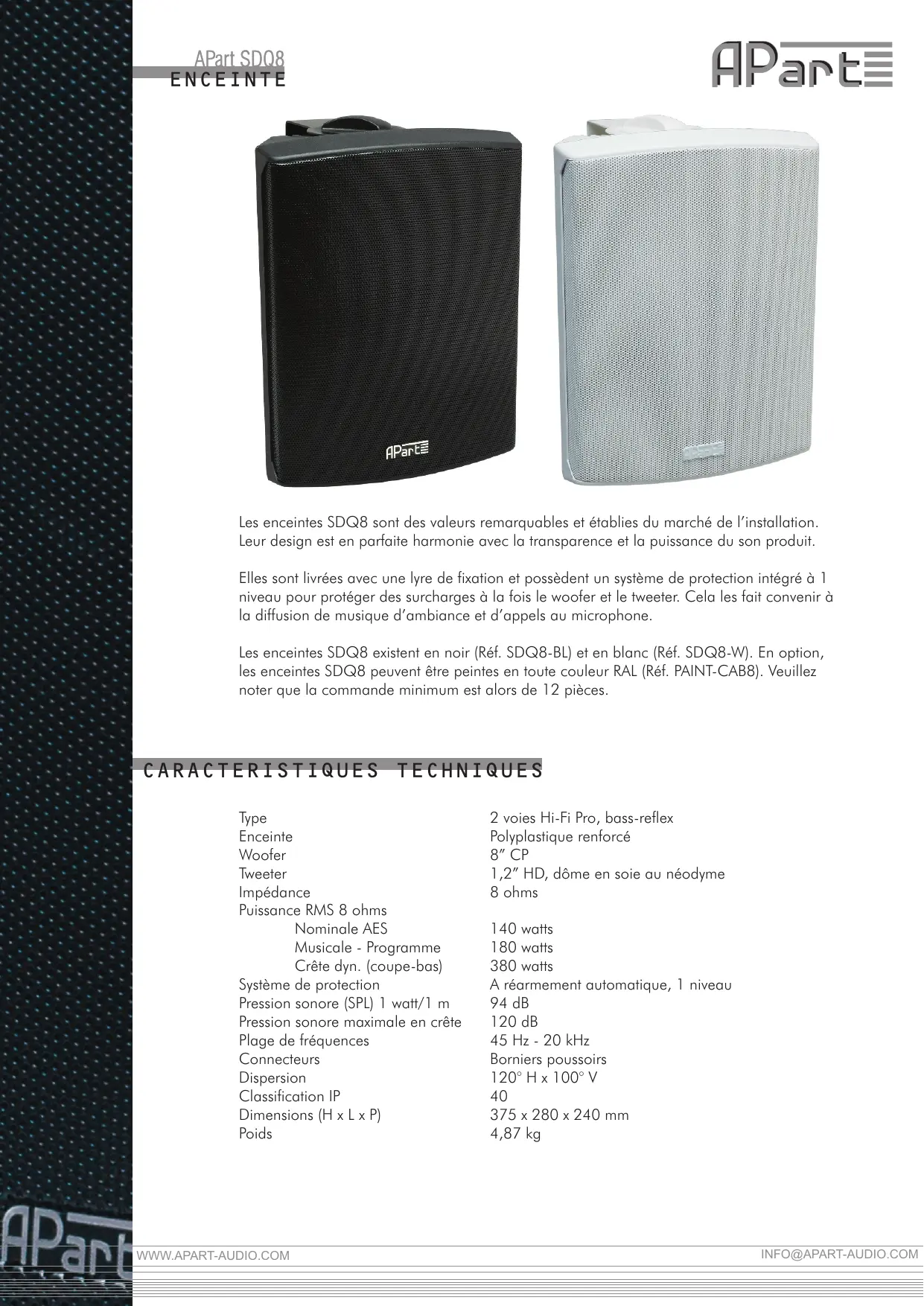 Elles sont livrées avec une lyre de fixation et possèdent un système de protection intégré à 1 niveau pour protéger des surcharges à la fois le woofer et le tweeter. Cela les fait convenir à la diffusion de musique d’ambiance et d’appels au microphone. Les enceintes SDQ8 existent en noir (Réf. SDQ8-BL) et en blanc (Réf. SDQ8-W). En option, les enceintes SDQ8 peuvent être peintes en toute couleur RAL (Réf. PAINT-CAB8). Veuillez noter que la commande minimum est alors de 12 pièces.