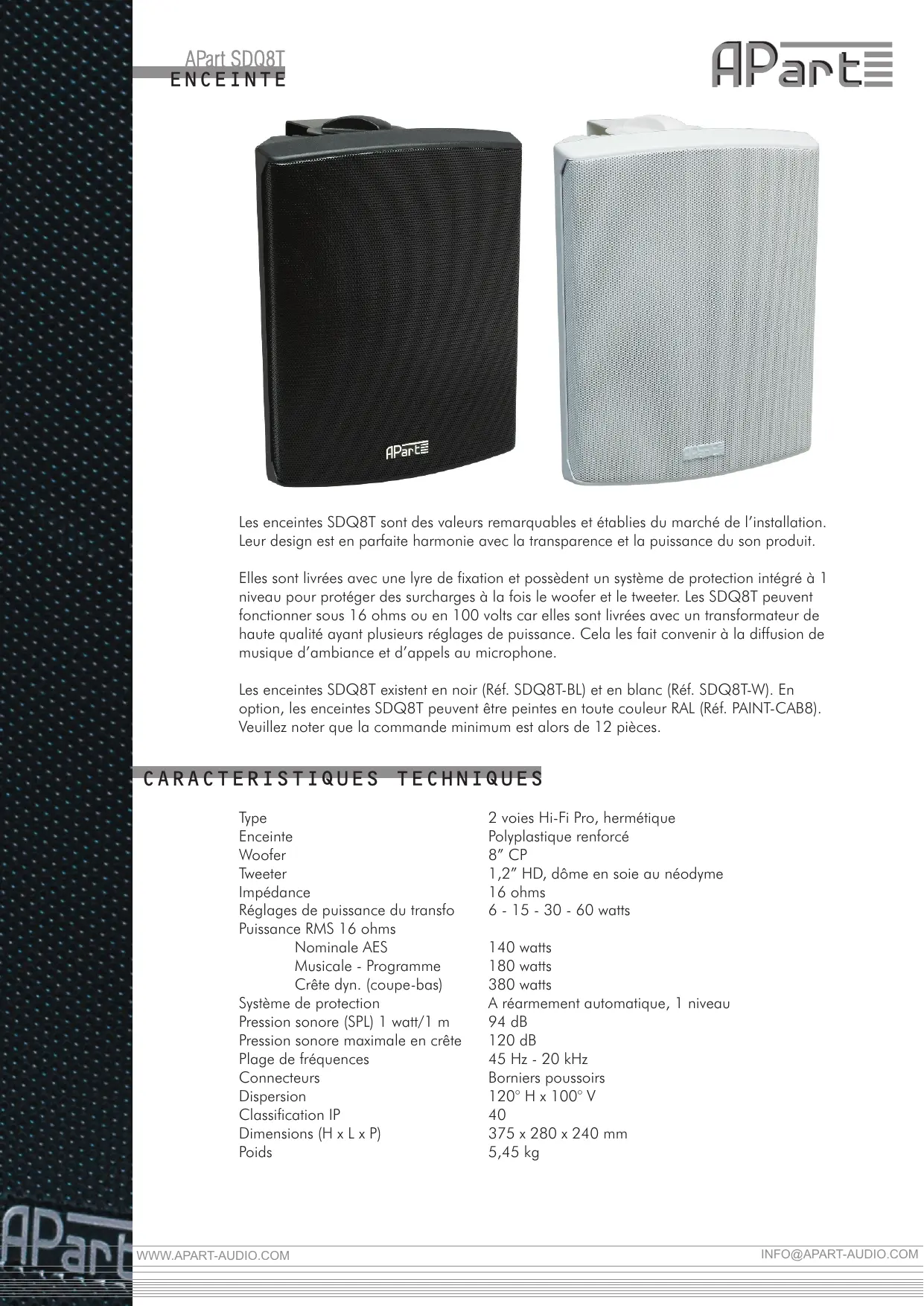 Leur design est en parfaite harmonie avec la transparence et la puissance du son produit. Elles sont livrées avec une lyre de fixation et possèdent un système de protection intégré à 1 niveau pour protéger des surcharges à la fois le woofer et le tweeter. Les SDQ8T peuvent fonctionner sous 16 ohms ou en 100 volts car elles sont livrées avec un transformateur de haute qualité ayant plusieurs réglages de puissance. Cela les fait convenir à la diffusion de musique d’ambiance et d’appels au microphone. Les enceintes SDQ8T existent en noir (Réf. SDQ8T-BL) et en blanc (Réf. SDQ8T-W). En option, les enceintes SDQ8T peuvent être peintes en toute couleur RAL (Réf. PAINT-CAB8). Veuillez noter que la commande minimum est alors de 12 pièces.