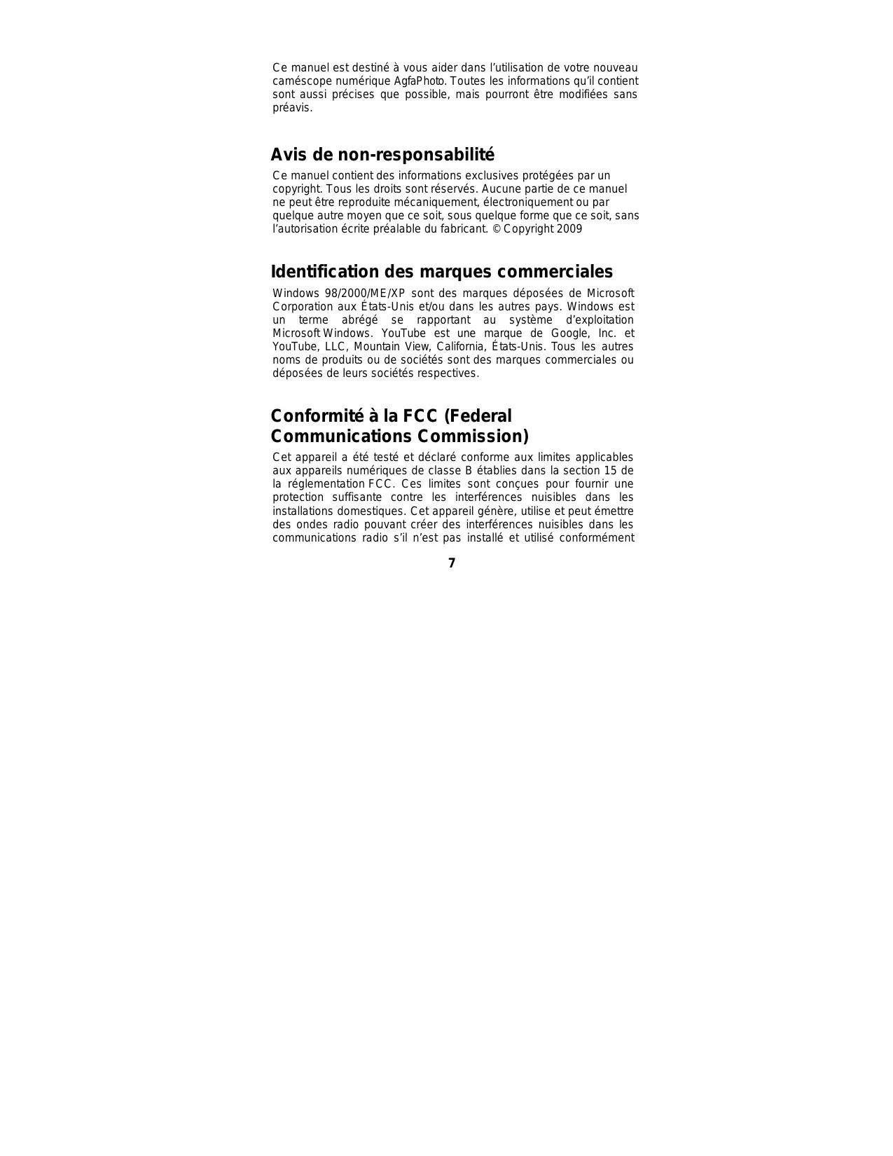 Ce manuel est destiné à vous aider dans l’utilisation de votre nouveau caméscope numérique AgfaPhoto. Toutes les informations qu’il contient sont aussi précises que possible, mais pourront être modifiées sans préavis. Avis de non-responsabilité Ce manuel contient des informations exclusives protégées par un copyright. Tous les droits sont réservés. Aucune partie de ce manuel ne peut être reproduite mécaniquement, électroniquement ou par quelque autre moyen que ce soit, sous quelque forme que ce soit, sans l’autorisation écrite préalable du fabricant. © Copyright 2009 Identification des marques commerciales Windows 98/2000/ME/XP sont des marques déposées de Microsoft Corporation aux États-Unis et/ou dans les autres pays. Windows est un terme abrégé se rapportant au système d’exploitation Microsoft Windows. YouTube est une marque de Google, Inc. et YouTube, LLC, Mountain View, California, États-Unis. Tous les autres noms de produits ou de sociétés sont des marques commerciales ou déposées de leurs sociétés respectives. Conformité à la FCC (Federal Communications Commission) Cet appareil a été testé et déclaré conforme aux limites applicables aux appareils numériques de classe B établies dans la section 15 de la réglementation FCC. Ces limites sont conçues pour fournir une protection suffisante contre les interférences nuisibles dans les installations domestiques. Cet appareil génère, utilise et peut émettre des ondes radio pouvant créer des interférences nuisibles dans les communications radio s’il n’est pas installé et utilisé conformément