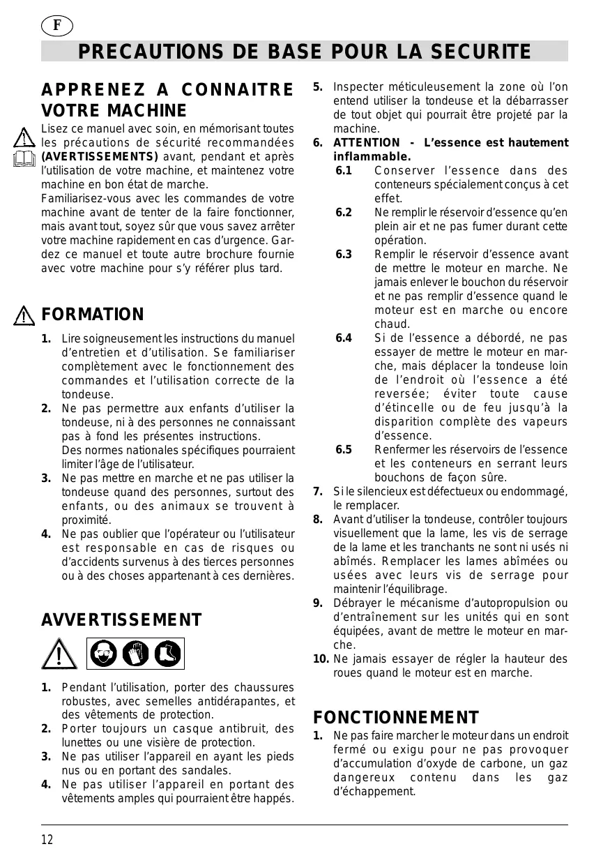 6. ATTENTION - L’essence est hautement inflammable. 6.1 Conserver l’essence dans des conteneurs spécialement conçus à cet effet. 6.2 Ne remplir le réservoir d’essence qu’en plein air et ne pas fumer durant cette opération. 6.3 Remplir le réservoir d’essence avant de mettre le moteur en marche. Ne jamais enlever le bouchon du réservoir et ne pas remplir d’essence quand le moteur est en marche ou encore chaud. 6.4 Si de l’essence a débordé, ne pas essayer de mettre le moteur en marche, mais déplacer la tondeuse loin de l’endroit où l’essence a été reversée; éviter toute cause d’étincelle ou de feu jusqu’à la disparition complète des vapeurs d’essence. 6.5 Renfermer les réservoirs de l’essence et les conteneurs en serrant leurs bouchons de façon sûre. 7. Si le silencieux est défectueux ou endommagé, le remplacer. 8. Avant d’utiliser la tondeuse, contrôler toujours visuellement que la lame, les vis de serrage de la lame et les tranchants ne sont ni usés ni abîmés. Remplacer les lames abîmées ou usées avec leurs vis de serrage pour maintenir l’équilibrage. 9. Débrayer le mécanisme d’autopropulsion ou d’entraînement sur les unités qui en sont équipées, avant de mettre le moteur en marche. 10. Ne jamais essayer de régler la hauteur des roues quand le moteur est en marche.