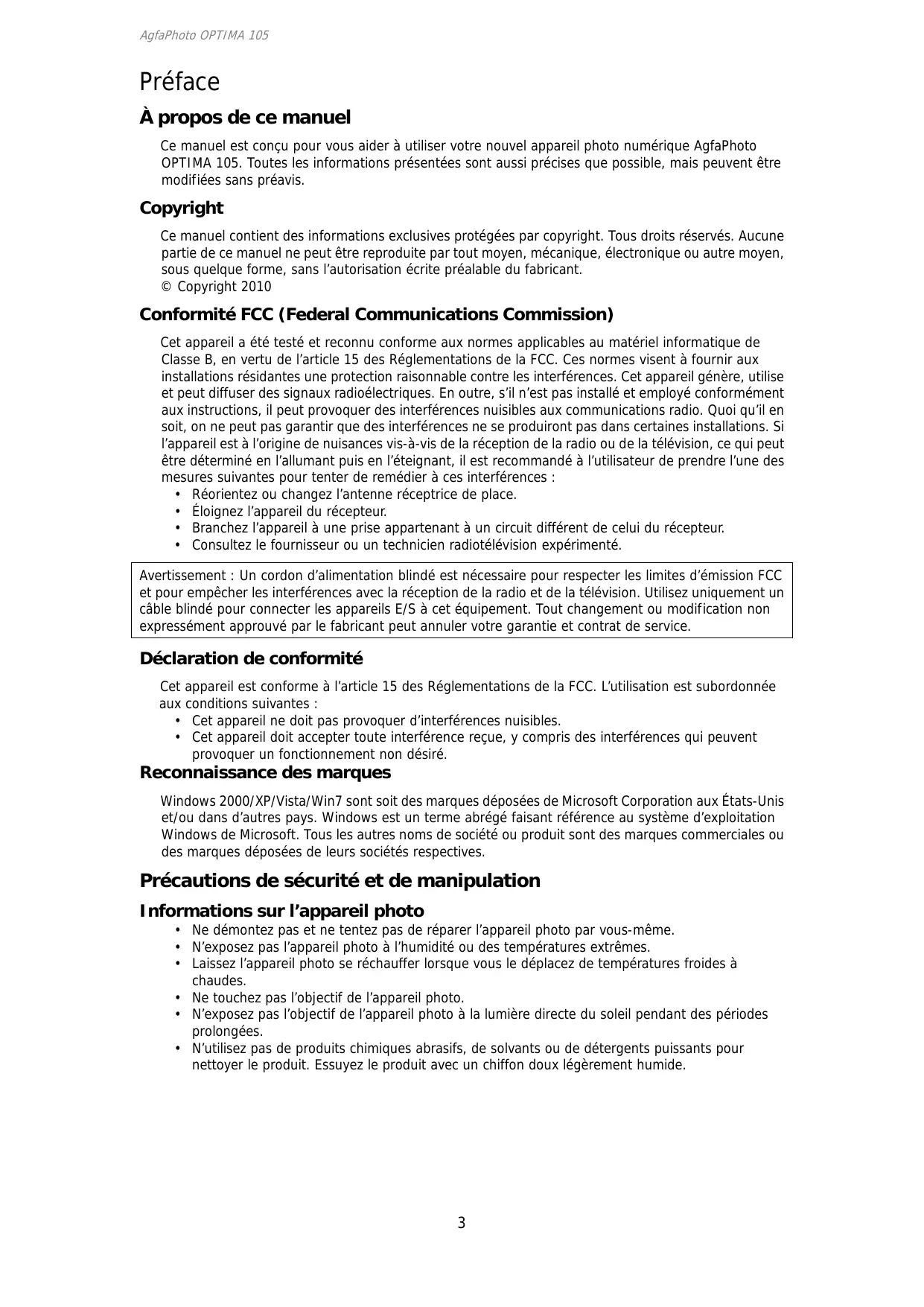 AgfaPhoto OPTIMA 105 Préface À propos de ce manuel Ce manuel est conçu pour vous aider à utiliser votre nouvel appareil photo numérique AgfaPhoto OPTIMA 105. Toutes les informations présentées sont aussi précises que possible, mais peuvent être modifiées sans préavis. Copyright Ce manuel contient des informations exclusives protégées par copyright. Tous droits réservés. Aucune partie de ce manuel ne peut être reproduite par tout moyen, mécanique, électronique ou autre moyen, sous quelque forme, sans l’autorisation écrite préalable du fabricant. © Copyright 2010 Conformité FCC (Federal Communications Commission) Cet appareil a été testé et reconnu conforme aux normes applicables au matériel informatique de Classe B, en vertu de l’article 15 des Réglementations de la FCC. Ces normes visent à fournir aux installations résidantes une protection raisonnable contre les interférences. Cet appareil génère, utilise et peut diffuser des signaux radioélectriques. En outre, s’il n’est pas installé et employé conformément aux instructions, il peut provoquer des interférences nuisibles aux communications radio. Quoi qu’il en soit, on ne peut pas garantir que des interférences ne se produiront pas dans certaines installations. Si l’appareil est à l’origine de nuisances vis-à-vis de la réception de la radio ou de la télévision, ce qui peut être déterminé en l’allumant puis en l’éteignant, il est recommandé à l’utilisateur de prendre l’une des mesures suivantes pour tenter de remédier à ces interférences :