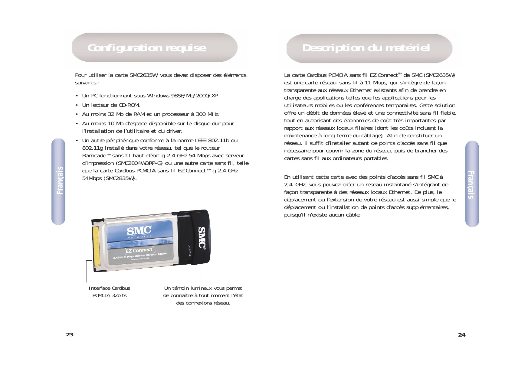 La carte Cardbus PCMCIA sans fil EZ ConnectTM de SMC (SMC2635W) est une carte réseau sans fil à 11 Mbps, qui s’intègre de façon transparente aux réseaux Ethernet existants afin de prendre en charge des applications telles que les applications pour les utilisateurs mobiles ou les conférences temporaires. Cette solution offre un débit de données élevé et une connectivité sans fil fiable, tout en autorisant des économies de coût très importantes par rapport aux réseaux locaux filaires (dont les coûts incluent la maintenance à long terme du câblage). Afin de constituer un réseau, il suffit d’installer autant de points d’accès sans fil que nécessaire pour couvrir la zone du réseau, puis de brancher des cartes sans fil aux ordinateurs portables. Français Un PC fonctionnant sous Windows 98SE/Me/2000/XP. Un lecteur de CD-ROM. Au moins 32 Mo de RAM et un processeur à 300 MHz. Au moins 10 Mo d’espace disponible sur le disque dur pour l’installation de l’utilitaire et du driver.