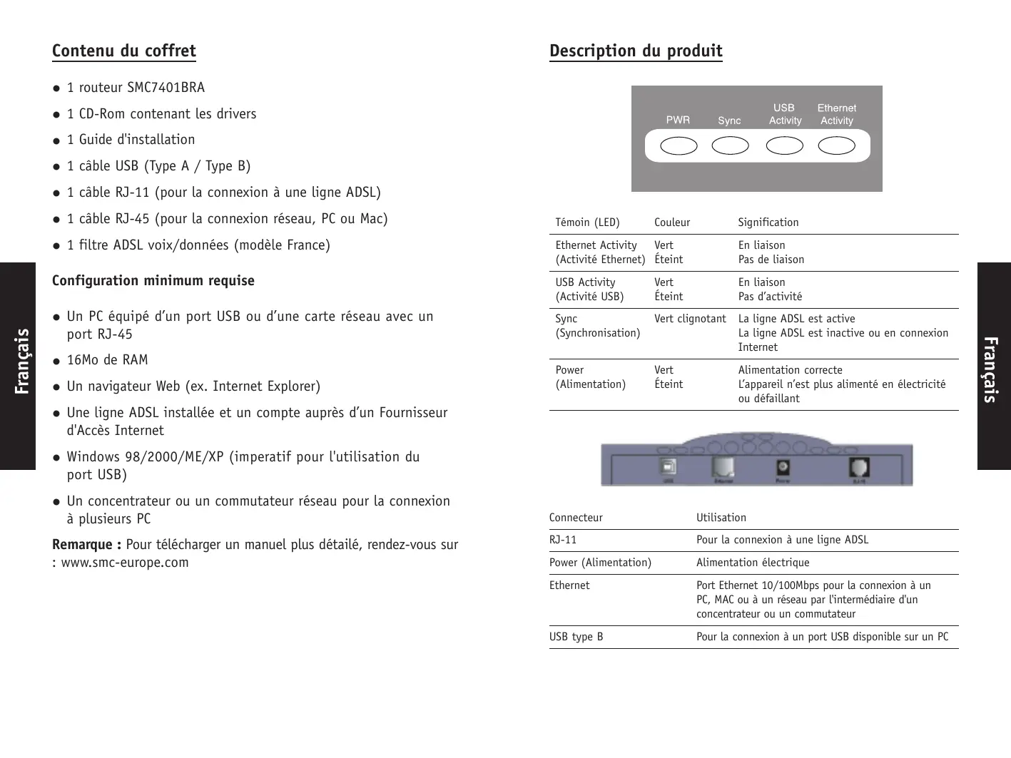 1 routeur SMC7401BRA - 1 CD-Rom contenant les drivers - 1 Guide d'installation - 1 câble USB (Type A / Type B) - 1 câble RJ-11 (pour la connexion à une ligne ADSL) - 1 câble RJ-45 (pour la connexion réseau, PC ou Mac) - 1 filtre ADSL voix/données (modèle France)
