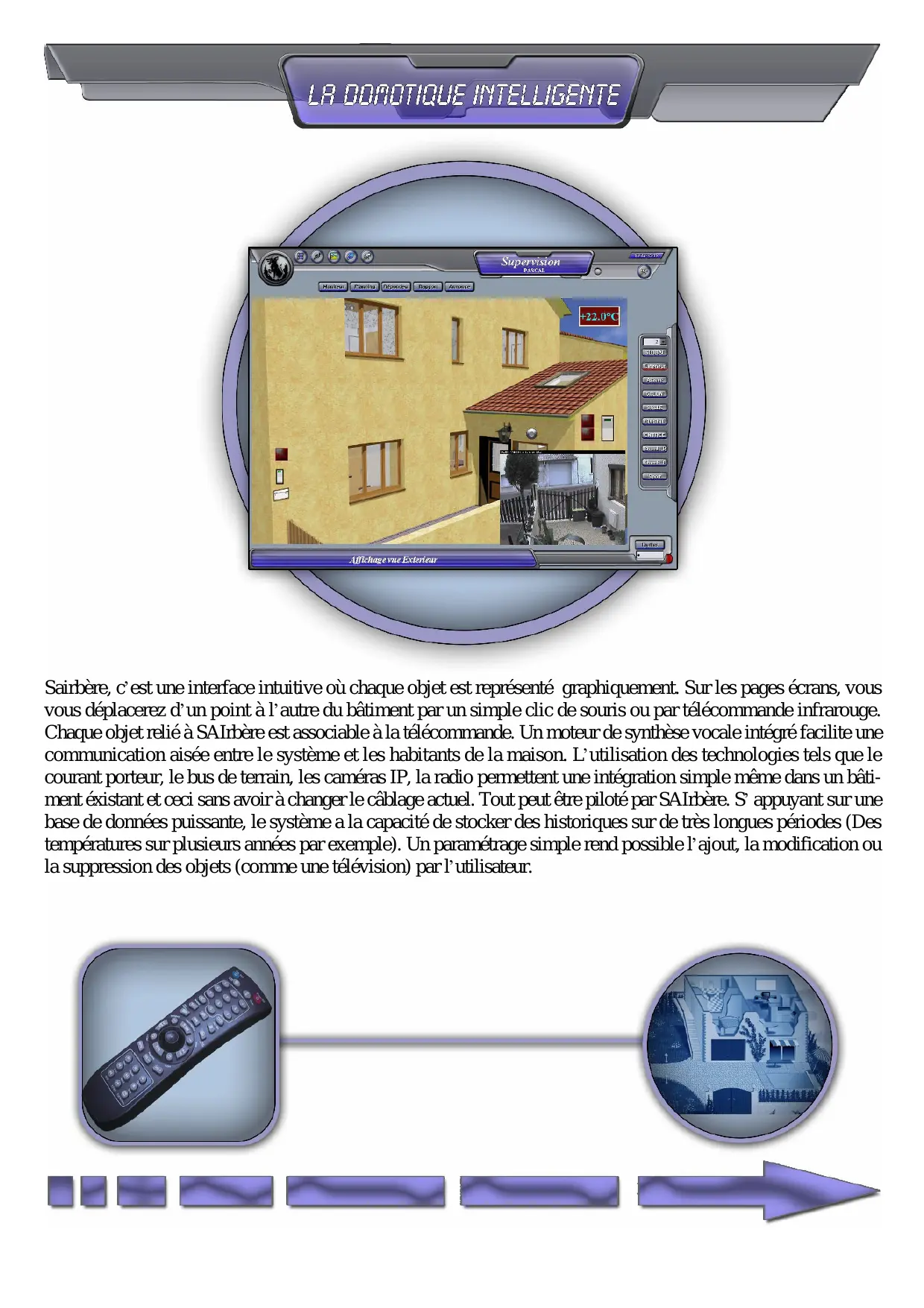 Sairbère, c’ est une interface intuitive où chaque objet est représenté graphiquement. Sur les pages écrans, vous vous déplacerez d’ un point à l’ autre du bâtiment par un simple clic de souris ou par télécommande infrarouge. Chaque objet relié à SAIrbère est associable à la télécommande. Un moteur de synthèse vocale intégré facilite une communication aisée entre le système et les habitants de la maison. L’ utilisation des technologies tels que le courant porteur, le bus de terrain, les caméras IP, la radio permettent une intégration simple même dans un bâtiment éxistant et ceci sans avoir à changer le câblage actuel. Tout peut être piloté par SAIrbère. S’appuyant sur une base de données puissante, le système a la capacité de stocker des historiques sur de très longues périodes (Des températures sur plusieurs années par exemple). Un paramétrage simple rend possible l’ ajout, la modification ou la suppression des objets (comme une télévision) par l’ utilisateur. SAIrbère intègre un planning graphique. Chaque objet connecté à SAIrbère peut être planifié dans le temps et ceci plusieurs mois à l’ avance. Des fonctions de duplications vous permettront un paramétrage aisé et rapide du planning. La fenêtre moniteur vous donnera l’ accès au réseau de caméra IP et vous permettra la visualisation en temps réel des images ou bien de repasser des séquences que SAIrbère aurait enregistrées suite à des évènements. SAIrbère prend en charge également la téléphonie. En effet équipé d’ un répondeur téléphonique interne il répondra à vos correspondants pendant votre absence. De plus, le pilotage d’ objets tels que l’ alarme,l’ éclairage, ou tout autre chose sera accessible à partir de votre téléphone après identifié par mot de passe. Vous pourrez également lui demander un rapport vocal de l’ état de votre habitation ou bien interroger le répondeur pour lire les messages laissés par vos correspondants. Un langage simple et puissant vous offrira la possibilité de créer des scripts d’ une façon simple par un glissé déplacé sans avoir de connaissance en automatisme. Ceci permet de réaliser des scénarios complexes liés à des conditions (Déclenchement de chauffage lié à la température, scénario d’ alarme, appel vers l’ extérieure par email ou téléphone etc…). Ce langage offre à SAIrbère de réagir avec son environnement. Vous pourrez ainsi réaliser des scénarios complexes. Avec la fenêtre annonce, vous pourrez laisser un message vocal à une personne. Ce message ce déclenchera lorsque que la personne passera devant le capteur de votre choix à partir de la date et de heure que vous aurez fixées. La fenêtre de configuration vous permet de créer les utilisateurs pouvant avoir accès à SAIrbère. Chaque utilisateur créé possèdera des droits sur les pages écran et sur les objets. Cette fenêtre vous offrira également la possibilité de paramétrer le mode de fonctionnement de SAIrbère. Universel Domavenir Etudes et Réalisation contact : ma.micaelli@u-d.fr