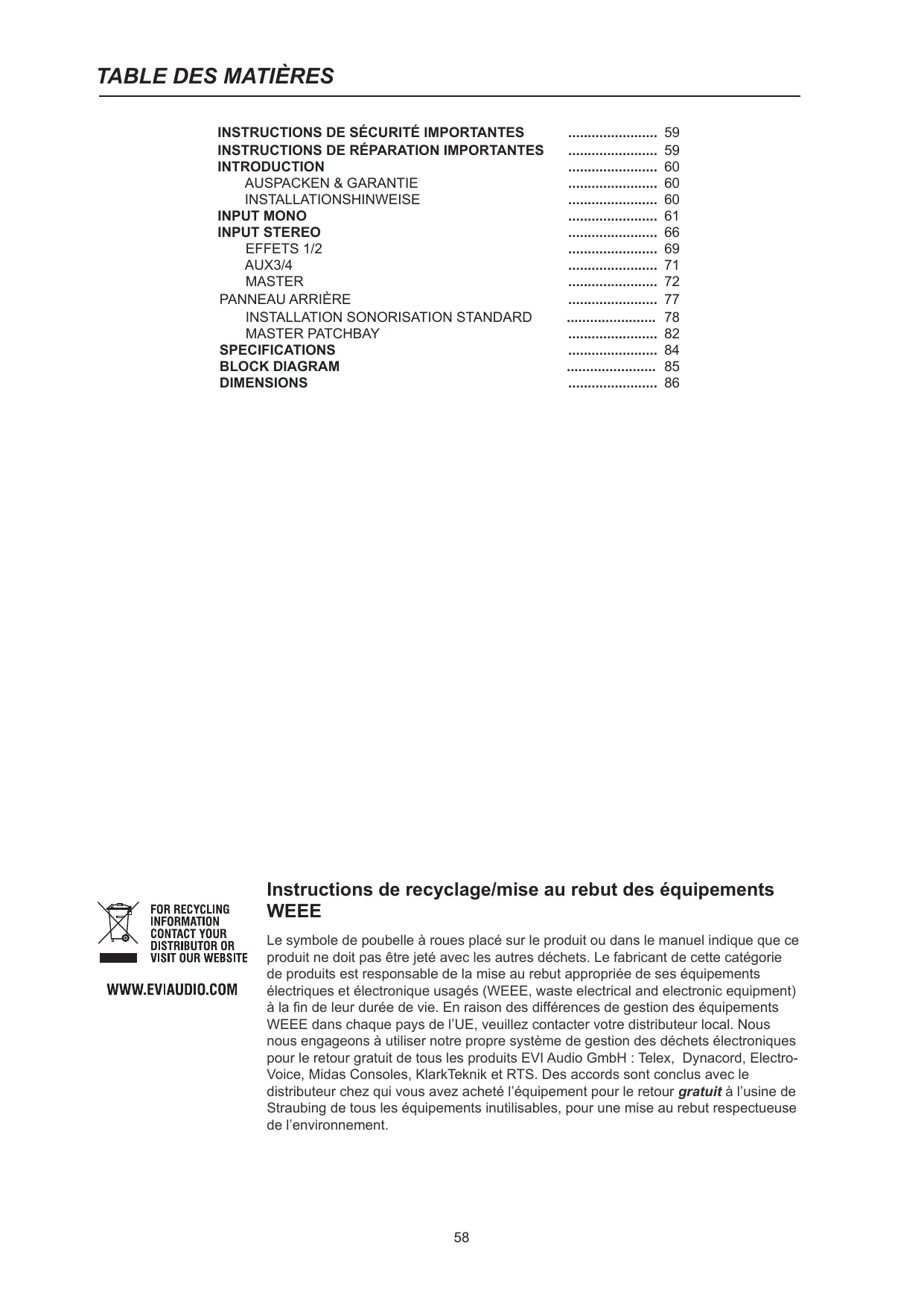 Instructions de recyclage/mise au rebut des équipements WEEE Le symbole de poubelle à roues placé sur le produit ou dans le manuel indique que ce produit ne doit pas être jeté avec les autres déchets. Le fabricant de cette catégorie de produits est responsable de la mise au rebut appropriée de ses équipements électriques et électronique usagés (WEEE, waste electrical and electronic equipment) à la fin de leur durée de vie. En raison des différences de gestion des équipements WEEE dans chaque pays de l'UE, veuillez contacter votre distributeur local. Nous nous engageons à utiliser notre propre système de gestion des déchets électroniques pour le retour gratuit de tous les produits EVI Audio GmbH : Telex, Dynacord, Electro- Voice, Midas Consoles, KlarkTeknik et RTS. Des accords sont conclus avec le distributeur chez qui vous avez acheté l'équipement pour le retour gratuit à l'usine de Straubing de tous les équipements inutilisables, pour une mise au rebut respectueuse de l'environnement.