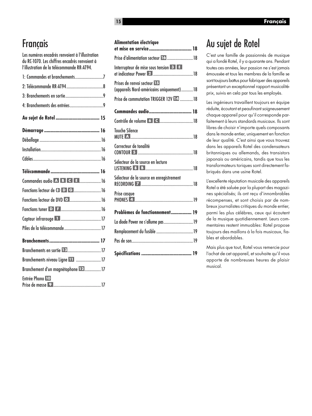 Mais plus que tout, Rotel vous remercie pour l'achat de cet appareil, et souhaite qu'il vous apporte de nombreuses heures de musique.