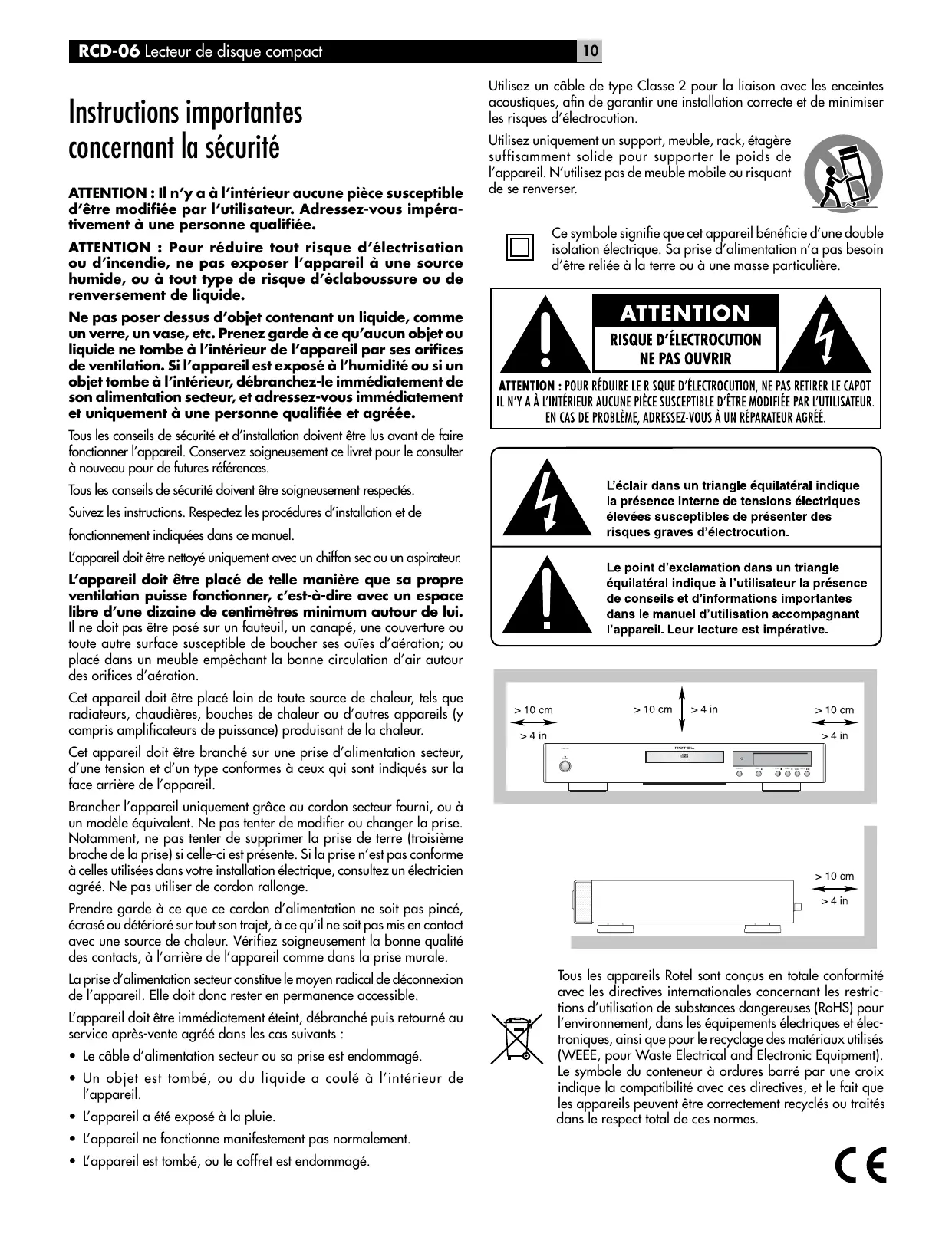 Veuillez lire ce manuel d’utilisation très soigneusement. Il vous donne toutes les informations nécessaires aux branchements et fonctionnement du RCD-06. Si vous vous posez encore des questions, n’hésitez pas à contacter immédiatement votre revendeur agréé Rotel. Conservez soigneusement l’emballage du RCD-06. Il constitue le meilleur et le plus sûr moyen pour le transport futur de votre nouvel appareil, afin d’éviter tout dommage sérieux à celui-ci. Remplissez et envoyez le coupon d’enregistrement fourni dans l’emballage du RCD-06. Conservez la facture de votre appareil : c’est la meilleure preuve de votre propriété et de la date réelle d’achat. Elle sera nécessaire pour mettre éventuellement en jeu la garantie.