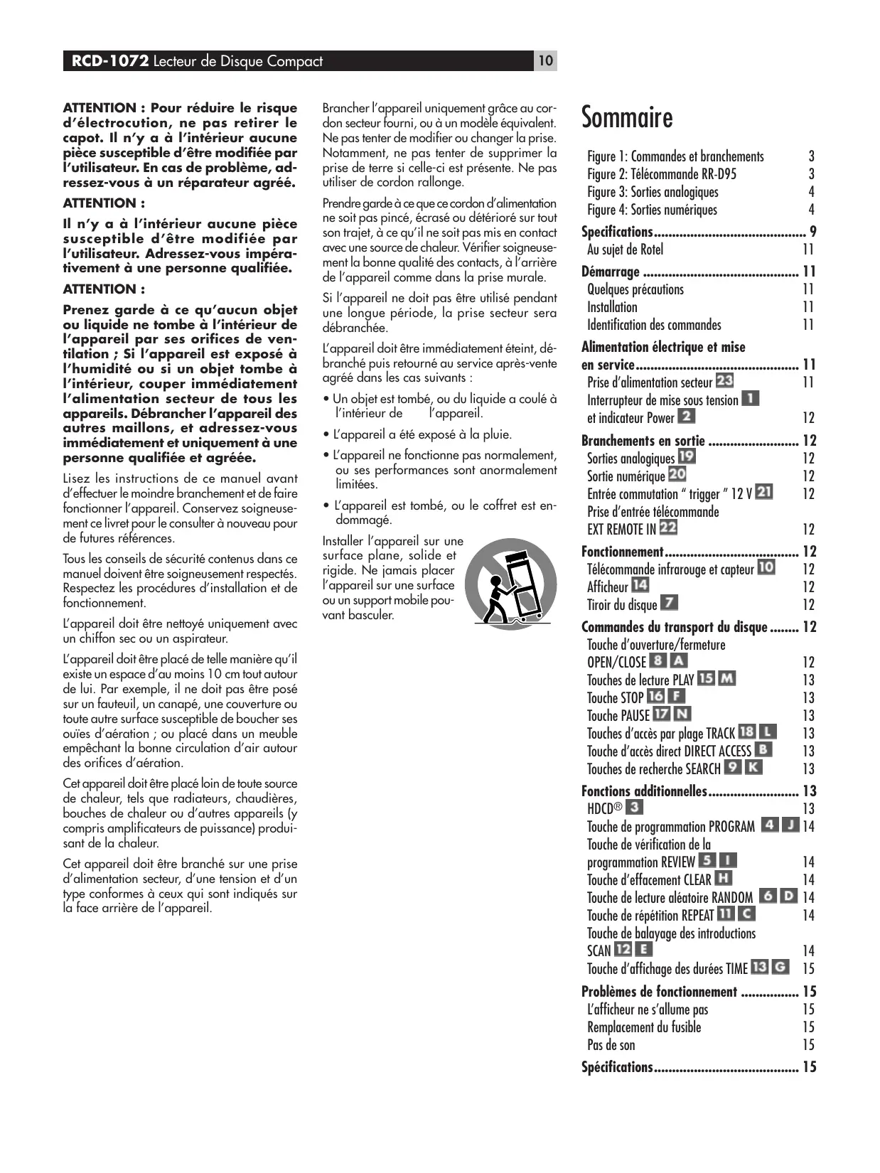 RCD-1072 Lecteur de Disque Compact 10 ATTENTION : Pour réduire le d'électrocution, ne pas retirer le capot. Il n’y a à l'intérieur aucune pièce susceptible d’être modifiée par l'utilisateur. En cas de problème, ad- ressez-vous à un réparateur agréé. ATTENTION : Il n'y a à l'intérieur aucune pièce susceptible d’être modifiée par l'utilisateur. Adressez-vous impéra- tivement à une personne qualifiée. ATTENTION : Prenez garde à ce qu'aucun objet ou liquide ne tombe à l’intérieur de l’appareil par ses orifices de ven- tilation ; Si l'appareil est exposé à l'humidité ou si un objet tombe à l'intérieur, couper immédiatement l'alimentation secteur de tous les appareils. Débrancher l'appareil des autres maillons, et adressez-vous immédiatement et uniquement à une personne qualifiée et agréée. Lisez les instructions de ce manuel avant d'effectuer le moindre branchement et de faire fonctionner l'appareil. Conservez soigneuse- ment ce livret pour le consulter à nouveau pour de futures références. Tous les conseils de sécurité contenus dans ce manuel doivent être soigneusement respectés. Respectez les procédures d'installation et de fonctionnement. L'appareil doit être nettoyé uniquement avec un chiffon sec ou un aspirateur. L'appareil doit être placé de telle manière qu'il existe un espace d'au moins 10 em tout autour de lui. Par exemple, il ne doit pas être posé sur un fauteuil, un canapé, une couverture ou toute autre surface susceptible de boucher ses ouïes d'aération ; ou placé dans un meuble empêchant la bonne circulation d'air autour des orifices d'aération. Cet appareil doit être placé loin de toute source de chaleur, tels que radiateurs, chaudières, bouches de chaleur ou d'autres appareils [y compris amplificateurs de puissance) produi- sant de la chaleur. Cet appareil doit être branché sur une prise d'alimentation secteur, d’une tension et d’un type conformes à ceux qui sont indiqués sur la face arrière de l'appareil. Brancher l'appareil uniquement grâce au cor- don secleur leurnt, ou à un modèle équivalent. Ne pas tenter de modifier ou changer la prise. Notamment, ne pas tenter de supprimer la prise de terre si celle-ci est présente. Ne pas utiliser de cordon rallonge. Prendre garde à ce que ce cordon d'alimentation ne soit pas pincé, écrasé ou détérioré sur tout son trajet, à ce qu’il ne soit pas mis en contact avec une source de chaleur. Vérifier soigneuse- ment la bonne qualité des contacts, à l'arrière de l'appareil comme dans la prise murale. Si l'appareil ne doit pas être utilisé pendant une longue période, la prise secteur sera débranchée. L'appareil doit être immédiatement éteint, dé- branché puis retourné au service après-vente agréé dans les cas suivants : + Un objet est tombé, ou du liquide a coulé à l'intérieur de l'appareil. + L'appareil a été exposé à la pluie. + L'appareil ne fonctionne pas normalement, ou ses performances sont anormalement limitées. + L'appareil est tombé, ou le coffret est en- dommagé. Installer l'appareil sur une surface plane, solide et rigide. Ne jamais placer l'appareil sur une surface ou un support mobile pou- vant basculer. Sommaire Figure 1: Commandes et branchements Figure 2: Télécommande RR-D95 Figure 3: Sorties analogiques Figure 4: Sorties numériques Specifications. Au sujet de Rotel Démarrage … Quelques précautions 1 Installation LL Identification des commandes LL Alimentation électrique et mise en service Prise d'alimentation secteur EE] ll Interrupteur de mise sous tension E et indicateur Power EX 12 Branchements en sorti Sorties analogiques LE Sortie numérique Entrée commutation “ trigger ” 12 V [21] 12 Prise d'entrée télécommande