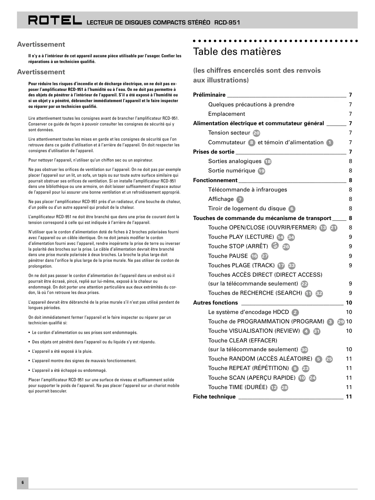LECTEUR DE DISQUES COMPACTS STÉRÉO RCD-951 Avertissement Il n’y a à l’intérieur de cet appareil aucune pièce utilisable par l’usager. Confier les réparations à un technicien qualifié. Avertissement Pour réduire les risques d’incendie et de décharge électrique, on ne doit pas exposer l’amplificateur RCD-951 à l’humidité ou à l’eau. On ne doit pas permettre à des objets de pénétrer à l’intérieur de l’appareil. S’il a été exposé à l’humidité ou si un objet y a pénétré, débrancher immédiatement l’appareil et le faire inspecter ou réparer par un technicien qualifié. Lire attentivement toutes les consignes avant de brancher l’amplificateur RCD-951. Conserver ce guide de façon à pouvoir consulter les consignes de sécurité qui y sont données. Lire attentivement toutes les mises en garde et les consignes de sécurité que l’on retrouve dans ce guide d’utilisation et à l’arrière de l’appareil. On doit respecter les consignes d’utilisation de l’appareil. ○ ○ ○ ○ ○ ○ ○ ○ ○ ○ ○ ○ ○ ○ ○ ○ ○ ○ ○ ○ ○ ○ ○ ○ ○ ○ ○ ○ ○ ○ ○ ○ ○ Table des matières (les chiffres encerclés sont des renvois aux illustrations) Préliminaire __________________________________________ 7 Quelques précautions à prendre