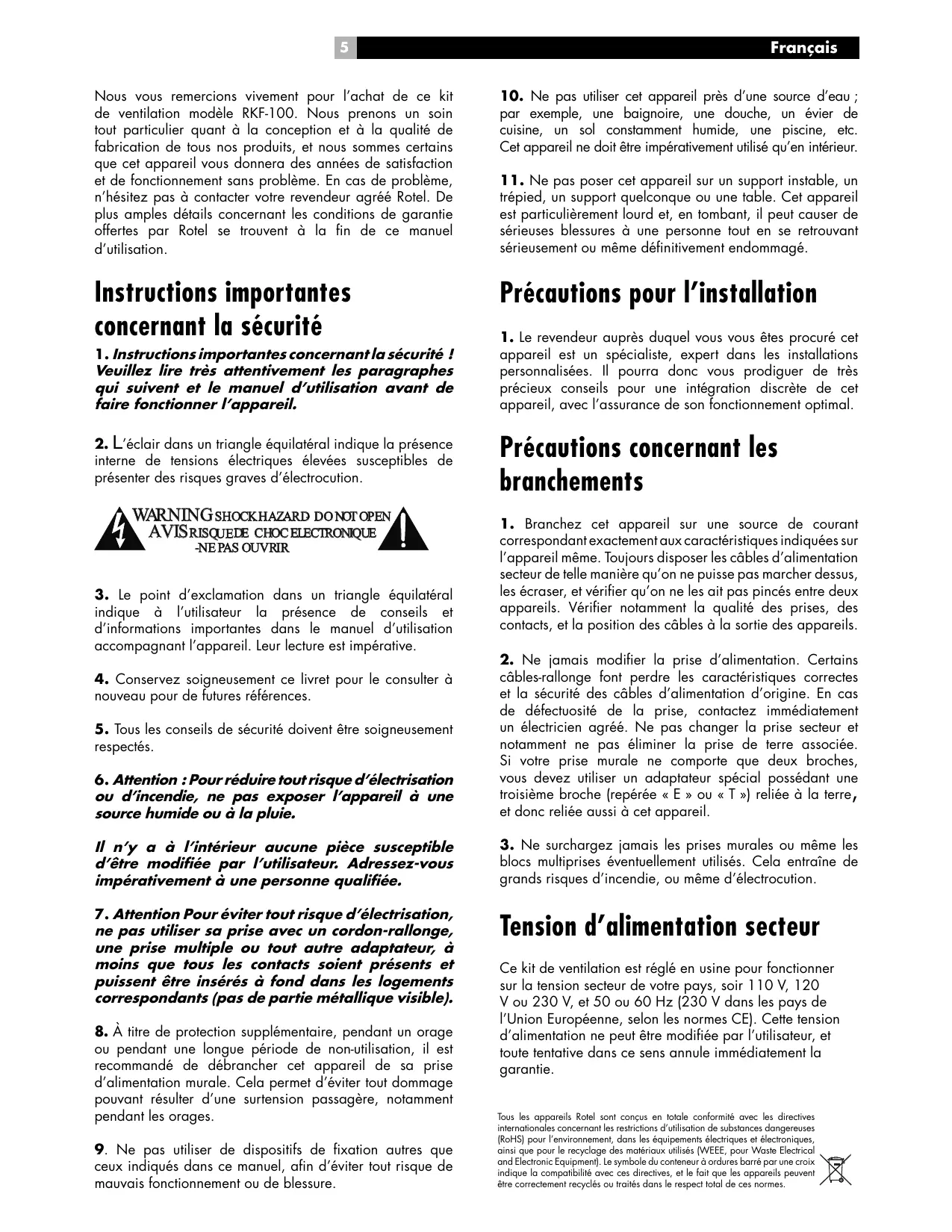 ceux indiqués dans ce manuel, afin d’éviter tout risque de mauvais fonctionnement ou de blessure. Ce kit de ventilation est réglé en usine pour fonctionner sur la tension secteur de votre pays, soir 110 V, 120 V ou 230 V, et 50 ou 60 Hz (230 V dans les pays de l’Union Européenne, selon les normes CE). Cette tension d’alimentation ne peut être modifiée par l’utilisateur, et toute tentative dans ce sens annule immédiatement la garantie. Tous les appareils Rotel sont conçus en totale conformité avec les directives internationales concernant les restrictions d’utilisation de substances dangereuses (RoHS) pour l’environnement, dans les équipements électriques et électroniques, ainsi que pour le recyclage des matériaux utilisés (WEEE, pour Waste Electrical and Electronic Equipment). Le symbole du conteneur à ordures barré par une croix indique la compatibilité avec ces directives, et le fait que les appareils peuvent être correctement recyclés ou traités dans le respect total de ces normes. RKF-100 Kit de Ventilation