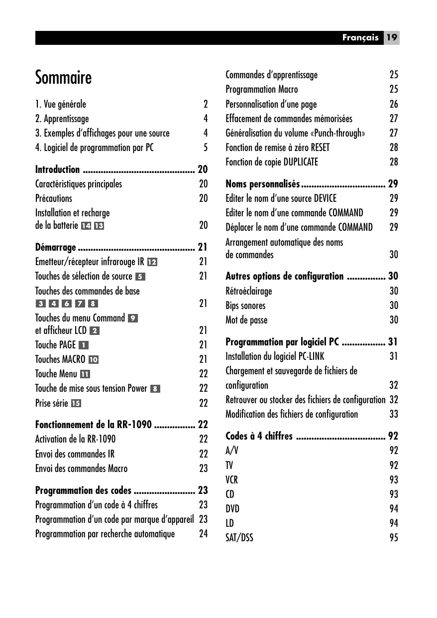 LCD en pressant la touche MENU COMMAND au-dessus du mot SETUP. NOTE: Quatre touches de la RR-1090 (repérées M1, M2, M3 et M4) peuvent stocker de multiples séquences macro de commandes – par exemple une séquence qui permettra, par simple pression sur une de ces quatre touches, d’allumer le téléviseur, de sélectionner la chaîne 5, d’allumer le processeur Surround et de choisir son entrée TV. Cette séquence macro est envoyée en pressant simplement la touche MACRO dans laquelle elle est mémorisée. Programmation des codes La RR-1090 intègre des centaines de codes de commandes préprogrammées pour divers appareils. La programmation de la télécommande sous-entend que vous choisissiez les bons jeux de commandes infrarouge pour les appareils que vous possédez, et que vous assigniez un de ces jeux de commandes à chacune des huit touches DEVICE. Pour ce faire, vous devez simplement enter un code à 4 chiffres pour chaque maillon. Cette étape n’est nécessaire que lors de la première utilisation de la RR-1090. La meilleure façon de trouver le code correspondant à chacun des appareils que vous désirez télécommander à partir de la RR-1090 consiste à vous reporter à la fin de ce manuel, où les codes des différentes marques, par type de maillon, sont répertoriés. Mais si un maillon n’apparaît pas dans cette liste, il existe des méthodes alternatives pour trouver leur code spécifique. NOTE : La programmation (paramétrage) de la RR-1090 se fait à partir d’un menu de réglage Setup accessible en pressant la touche repérée MENU. A n’importe quel moment de ce paramétrage, vous pouvez revenir aux conditions normales de fonctionnement de la télécommande en pressant à nouveau cette touche MENU deux fois de suite. Trouvez le type et la marque de l’appareil désiré dans les listes présentes à la fin de ce manuel. Notez le code à 4 chiffres correspondant.