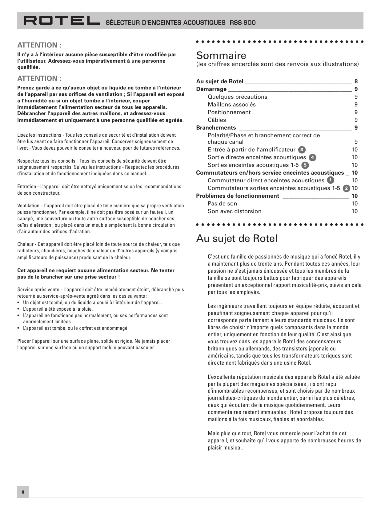 Veuillez tire ce manuel d'utilisation très soignement. Il vous donne toutes les informations nécessaires aux branchements et fonctionnement du RSS-900. Si vous vous posez encore des questions, n'hésitez pas à contacter immédiatement votre revendeur/agréé Rotel.
