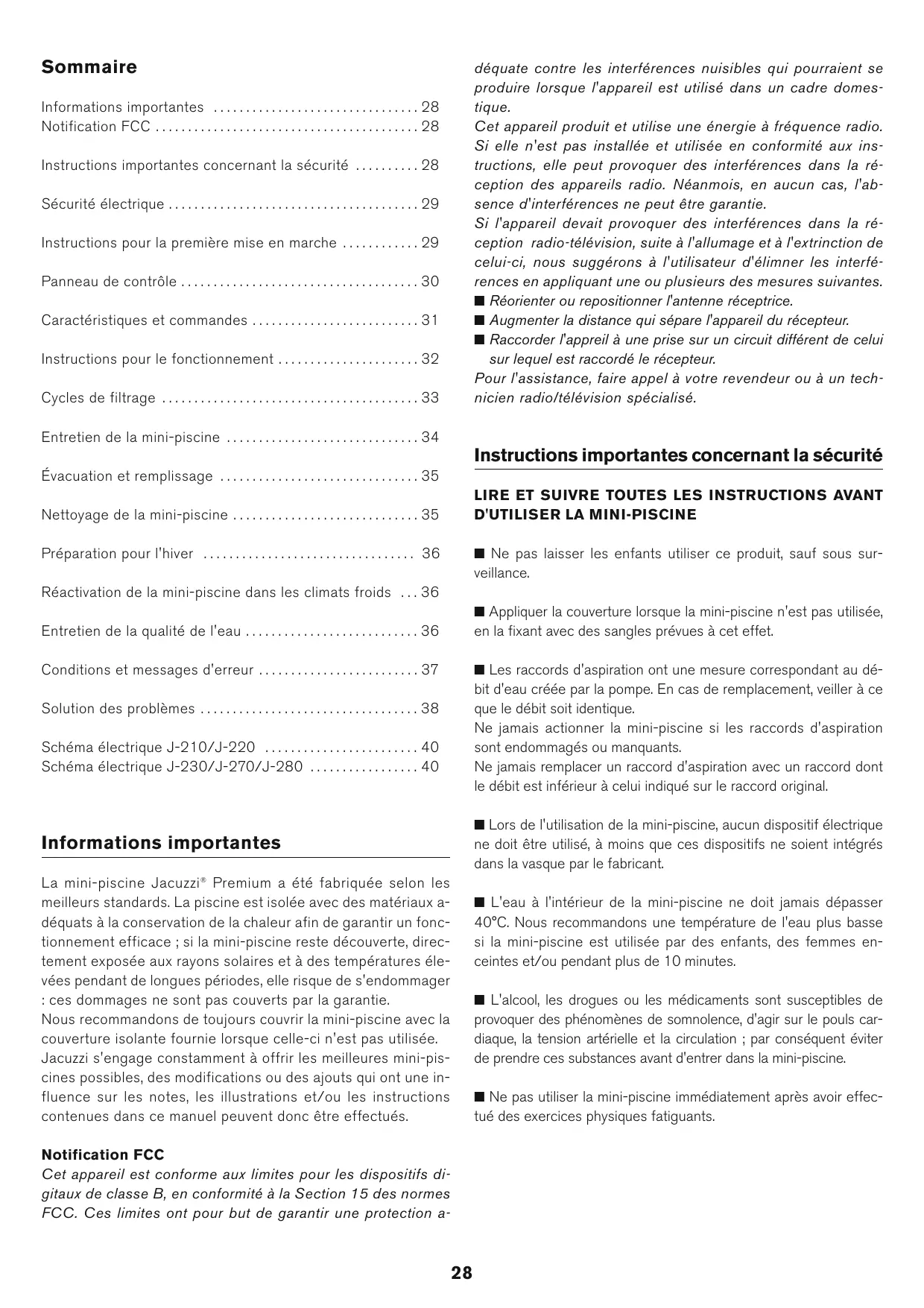 - Deutsch . . . . . . . . . . . . . . . . . . . . . . . . . . . . . . . . 41 déquate contre les interférences nuisibles qui pourraient se produire lorsque l'appareil est utilisé dans un cadre domestique. Cet appareil produit et utilise une énergie à fréquence radio. Si elle n'est pas installée et utilisée en conformité aux instructions, elle peut provoquer des interférences dans la réception des appareils radio. Néanmois, en aucun cas, l'absence d'interférences ne peut être garantie. Si l'appareil devait provoquer des interférences dans la réception radio-télévision, suite à l'allumage et à l'extrinction de celui-ci, nous suggérons à l'utilisateur d'élimner les interférences en appliquant une ou plusieurs des mesures suivantes. Réorienter ou repositionner l'antenne réceptrice. Augmenter la distance qui sépare l'appareil du récepteur. Raccorder l'appreil à une prise sur un circuit différent de celui sur lequel est raccordé le récepteur. Pour l'assistance, faire appel à votre revendeur ou à un technicien radio/télévision spécialisé. Informations importantes . . . . . . . . . . . . . . . . . . . . . . . . . . . . . . . . 28 Notification FCC . . . . . . . . . . . . . . . . . . . . . . . . . . . . . . . . . . . . . . . . . 28 Instructions importantes concernant la sécurité . . . . . . . . . . 28 Sécurité électrique . . . . . . . . . . . . . . . . . . . . . . . . . . . . . . . . . . . . . . . 29 Instructions pour la première mise en marche . . . . . . . . . . . . 29 Panneau de contrôle . . . . . . . . . . . . . . . . . . . . . . . . . . . . . . . . . . . . . 30 Caractéristiques et commandes . . . . . . . . . . . . . . . . . . . . . . . . . . 31 Instructions pour le fonctionnement . . . . . . . . . . . . . . . . . . . . . . 32 Cycles de filtrage . . . . . . . . . . . . . . . . . . . . . . . . . . . . . . . . . . . . . . . . 33 Entretien de la mini-piscine . . . . . . . . . . . . . . . . . . . . . . . . . . . . . . 34 Instructions importantes concernant la sécurité Évacuation et remplissage . . . . . . . . . . . . . . . . . . . . . . . . . . . . . . . 35 Nettoyage de la mini-piscine . . . . . . . . . . . . . . . . . . . . . . . . . . . . . 35 Préparation pour l'hiver . . . . . . . . . . . . . . . . . . . . . . . . . . . . . . . . . 36 Ne pas laisser les enfants utiliser ce produit, sauf sous sur- veillance. Réactivation de la mini-piscine dans les climats froids . . . 36 Appliquer la couverture lorsque la mini-piscine n'est pas utilisée, Entretien de la qualité de l'eau . . . . . . . . . . . . . . . . . . . . . . . . . . . 36 en la fixant avec des sangles prévues à cet effet. Conditions et messages d'erreur . . . . . . . . . . . . . . . . . . . . . . . . . 37 Les raccords d'aspiration ont une mesure correspondant au dé- bit d'eau créée par la pompe. En cas de remplacement, veiller à ce que le débit soit identique. Ne jamais actionner la mini-piscine si les raccords d'aspiration sont endommagés ou manquants. Ne jamais remplacer un raccord d'aspiration avec un raccord dont le débit est inférieur à celui indiqué sur le raccord original. Solution des problèmes . . . . . . . . . . . . . . . . . . . . . . . . . . . . . . . . . . 38 Schéma électrique J-210/J-220 . . . . . . . . . . . . . . . . . . . . . . . . 40 Schéma électrique J-230/J-270/J-280 . . . . . . . . . . . . . . . . . 40 Lors de l'utilisation de la mini-piscine, aucun dispositif électrique Informations importantes ne doit être utilisé, à moins que ces dispositifs ne soient intégrés dans la vasque par le fabricant. La mini-piscine Jacuzzi ® Premium a été fabriquée selon les meilleurs standards. La piscine est isolée avec des matériaux adéquats à la conservation de la chaleur afin de garantir un fonctionnement efficace ; si la mini-piscine reste découverte, directement exposée aux rayons solaires et à des températures élevées pendant de longues périodes, elle risque de s'endommager : ces dommages ne sont pas couverts par la garantie. Nous recommandons de toujours couvrir la mini-piscine avec la couverture isolante fournie lorsque celle-ci n'est pas utilisée. Jacuzzi s'engage constamment à offrir les meilleures mini-piscines possibles, des modifications ou des ajouts qui ont une influence sur les notes, les illustrations et/ou les instructions contenues dans ce manuel peuvent donc être effectués. L'eau à l'intérieur de la mini-piscine ne doit jamais dépasser 40°C. Nous recommandons une température de l'eau plus basse si la mini-piscine est utilisée par des enfants, des femmes enceintes et/ou pendant plus de 10 minutes. L'alcool, les drogues ou les médicaments sont susceptibles de provoquer des phénomènes de somnolence, d'agir sur le pouls cardiaque, la tension artérielle et la circulation ; par conséquent éviter de prendre ces substances avant d'entrer dans la mini-piscine. Ne pas utiliser la mini-piscine immédiatement après avoir effec- tué des exercices physiques fatiguants. Notification FCC Cet appareil est conforme aux limites pour les dispositifs digitaux de classe B, en conformité à la Section 15 des normes FCC. Ces limites ont pour but de garantir une protection a-