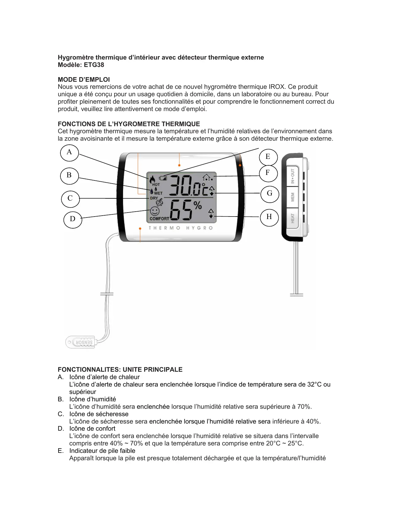 Nous vous remercions de votre achat de ce nouvel hygrometre thermique IROX. Ce produit unique a ete conu pour un usage quotidien a domicile, dans un laboratoire ou au bureau. Pour profiter pleinement de toutes ses fonctionnalités et pour comprendre le fonctionnement correct du produit, veuillez dire attentivement ce mode d'emploi.