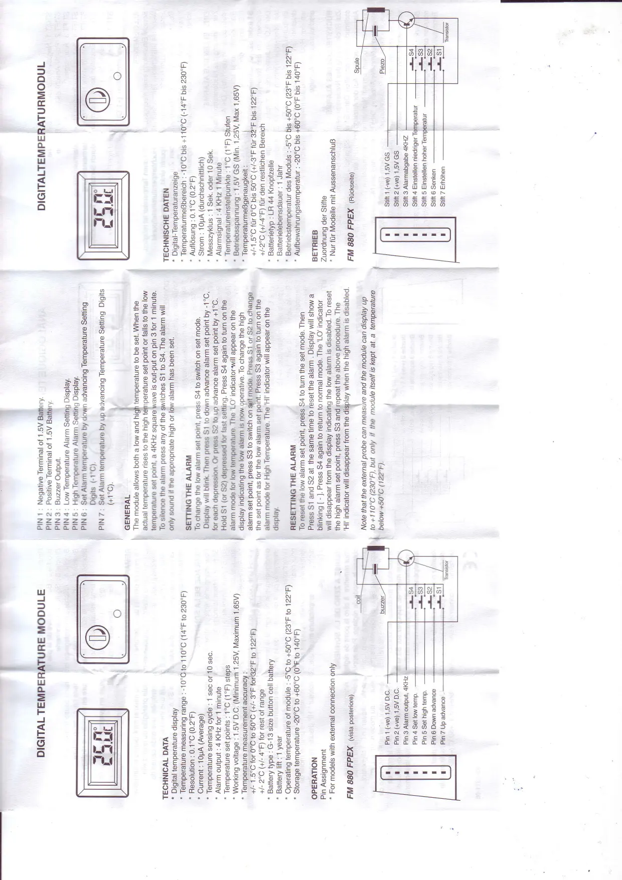 DONNEES TECHNIQUES Affichage analogue de la température Amplitude de mesure de temperature : - * Pécile d'air différent 0-1°C (0-2°C) Precision d amchage : 0. 1 °C ( 0. 2 °F ) Courant : 10uA ( moyenne) Coulant : TopA ( moyenne) Cycle de mesure de température : 1 second Puisance de la sonnerie : 4KHz pend Réglage de la température : 1°C (1°F) é Voltage de fonctionnement : 1,5V coursar Maximum 1,65V) Prééciation de mesure de température. Precision of measure of temperature: + / - 1.5°C de 0°C a 50°C (+ / - 3^ de 32°F +/-2°C (+/-4°F) pour le reste de l'amplitude Type de pile : pile bouton G-13 *Durée de vie de la pile:1 an Température de fonctionnement du modèle Température (1967) 200 Température d'entreposage -20°C à 60° UILISATION LOCALISATION DES BROCHES Pour les modèles avec un contact extéris 10.2.1.1.1.1.1.1.1.1.1.1.1.1.1.1.1.1.1.1.1.1.1.1.1.1.1.1.1.1.1.1.1.1.1.1.1.1.1.1.1.1.1.1.1.1.1.1.1.1.