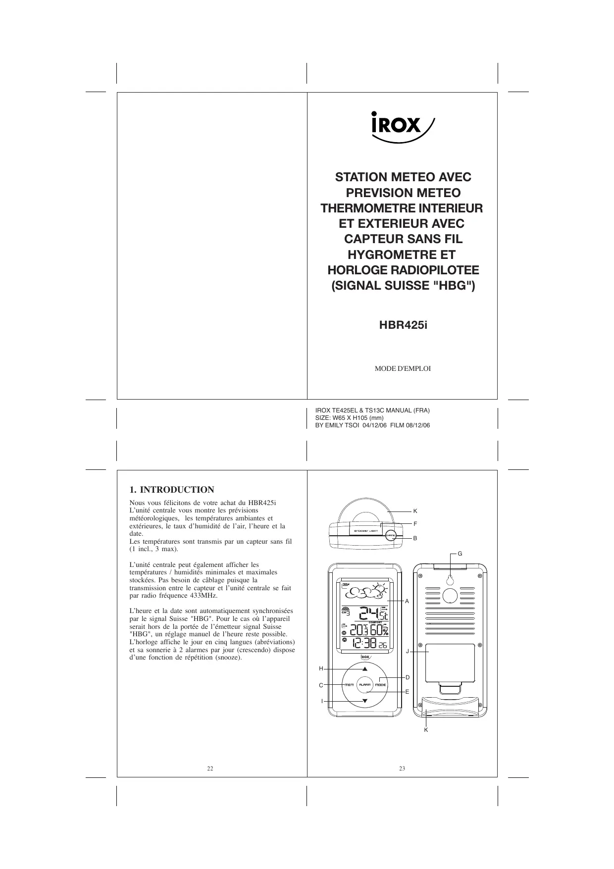 HBR425I - Station Météo IROX - Notice d'utilisation et mode d'emploi gratuit