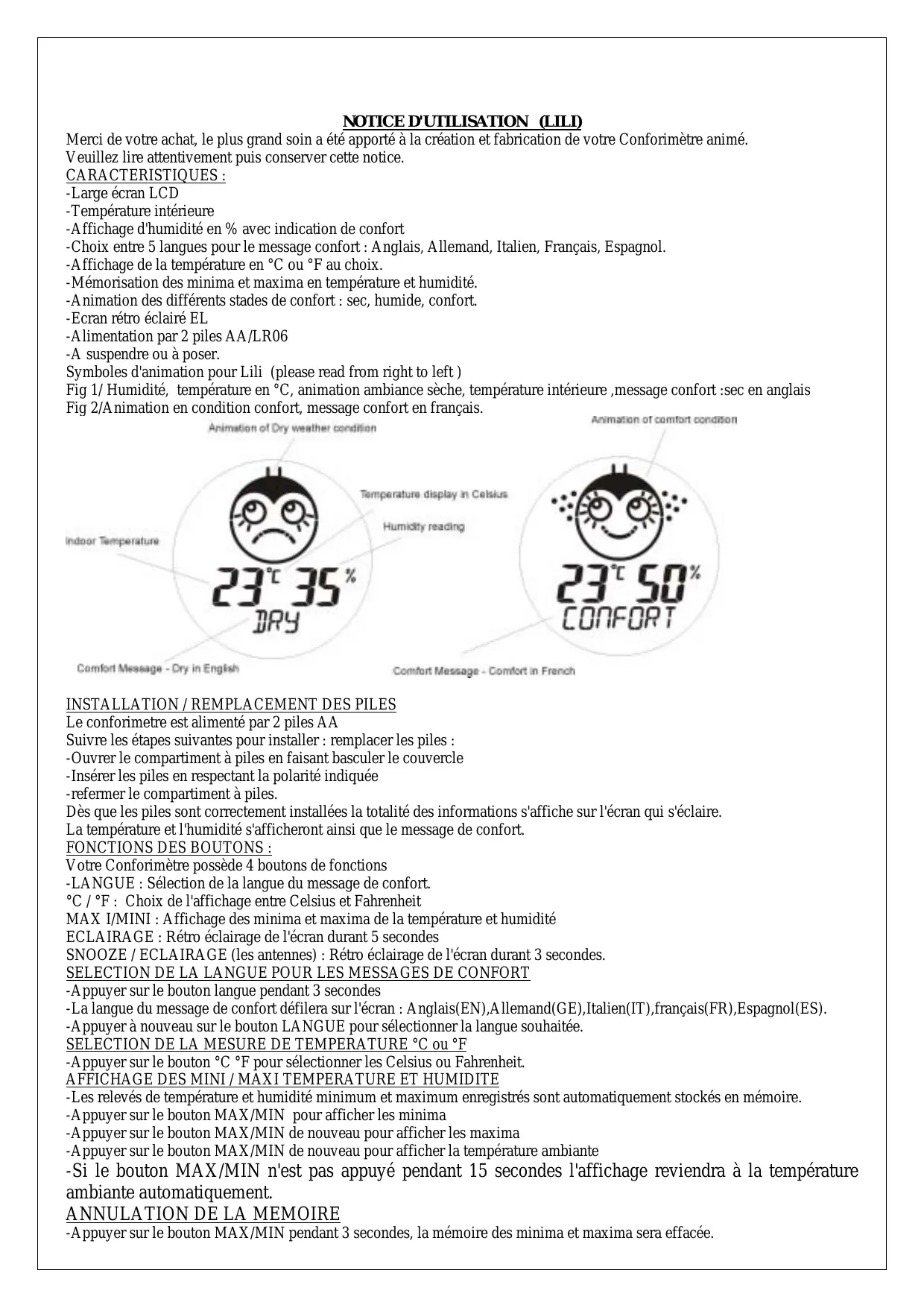Merci de votre achat, le plus grand soin a ete aported a la creation et fabrication de vour Conforimetre animé. Veuillez dire attentivement puis conserver cette notice. CHARACTERISTIQUES: -Large écran LCD -Témpérature interieure -Affichage d'humidité en % avec indication de comport -Choix entre 5 langues pour le message comport : Anglais, Allemand, Italien, Français, Espagnol. -Affichage de la température en ^ C ou ^ au choix. -Mémorisation des minima et maxima en température et humidité. - Animation des différents stades de comport : sec, humide, comport. -Ecran rétro éclaire EL -Alimentation par 2 piles AA/LR06 -A suspendre ou à poser. Symboles d'animation pour Lili (please read from right to left) Fig 1/ Humidité, température en °C, animation ambiance sèche, température interieure, message comport : sec en anglais Fig 2/Animation en condition comport, message comport en français.