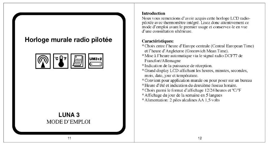 Nous vous remercions d'avoir acquis cette horloge LCD radiopilotee avec thermométre intégré. Lizez donc attentivement ce mode d'emploi avant le premier usage et conservez-le en vue d'une consultation ultérieure.