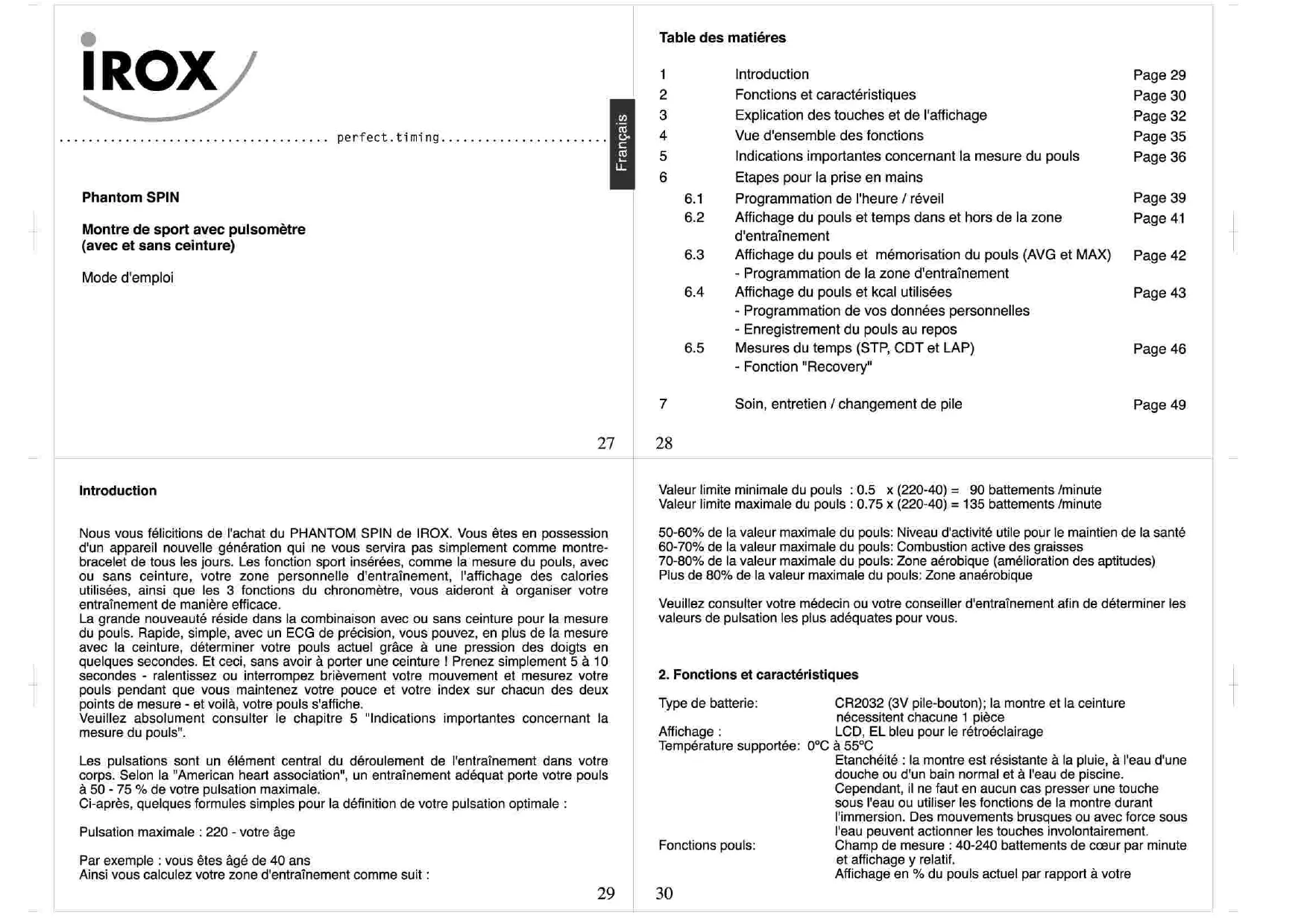 Nous vous félicitons de l'achat du PHANTOM SPIN de IROX. Vous êtes en possession d'un appareil nouvelle génération qui ne vous servira pas simplement comme montre-bracelet de tous les jours. Les fonctions sport insérées, comme la mesure du pouls, avec ou sans ceinture, votre zone personnelle d'entraînement, l'affichage des calories utilisées, ainsi que les 3 fonctions du chronomètre, vous aident à organiser votre entraînement de manière efficace.