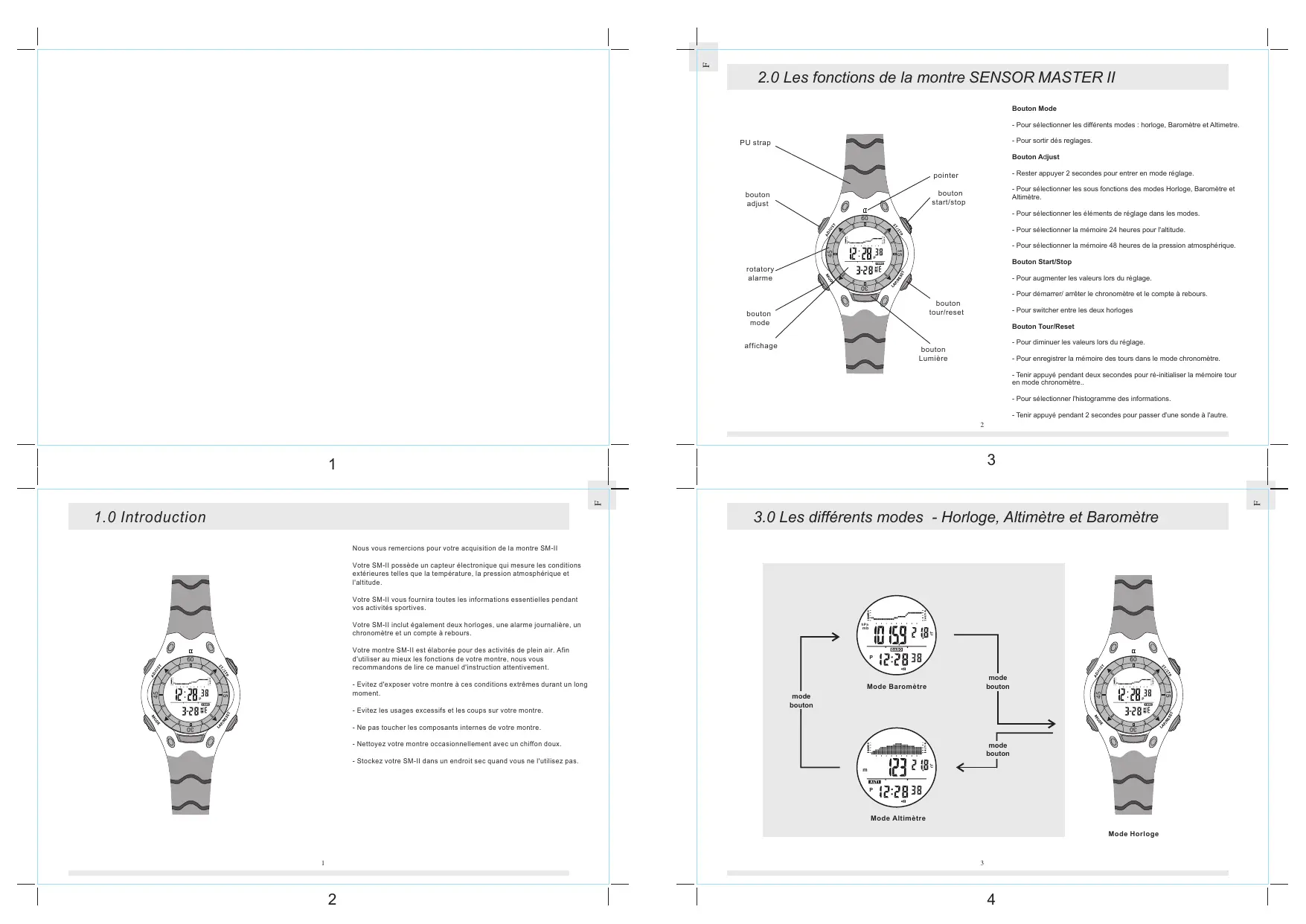 Nous vous remercions pour votre acquisition de la montre SM-II. Votre SM-II possède un capteur électronique qui mesure les conditions extérieures telles que la température, la pression atmosphérique et l'altitude. Votre SM-II vous fournira toutes les informations essentielles pendant vos activités sportives. Votre SM-II inclut également deux horloges, une alarme journalière, un chronomètre et un compte à rebours. Votre montre SM-II est conçue pour des activités de plein air. Afin d'utiliser au mieux les fonctions de votre montre, nous vous recommandons de lire ce manuel d'instruction attentivement. - Évitez d'exposer cette montre à ces conditions extrêmes durant un long moment. - Évitez les usages excessifs et les coups sur votre montre. - Ne pas toucher les composants internes de votre montre. - Nettoyez votre montre occasionnellement avec un chiffon doux. - Stockez votre SM-II dans un endroit sec quand vous ne l'utilisez pas.