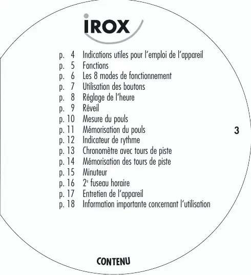 p. 4 p. 5 p. 6 p. 7 p. 8 p. 9 p. 10 p. 11 p. 12 p. 13 p. 14 p. 15 p. 16 p. 17 p. 18 Indications utiles pour l‘emploi de l‘appareil Fonctions Les 8 modes de fonctionnement Utilisation des boutons Réglage de l‘heure Réveil Mesure du pouls Mémorisation du pouls Indicateur de rythme Chronomètre avec tours de piste Mémorisation des tours de piste Minuteur 2e fuseau horaire Entretien de l‘appareil Information importante concernant l‘utilisation CON TENU
