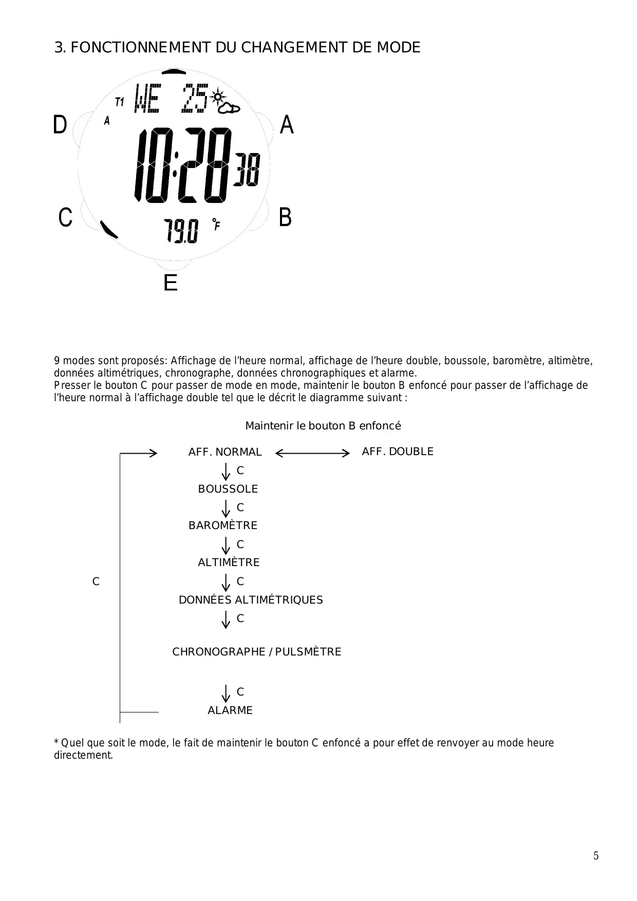 9 modes sont proposés: Affichage de l’heure normal, affichage de l’heure double, boussole, baromètre, altimètre, données altimétriques, chronographe, données chronographiques et alarme. Presser le bouton C pour passer de mode en mode, maintenir le bouton B enfoncé pour passer de l’affichage de l’heure normal à l’affichage double tel que le décrit le diagramme suivant : Maintenir le bouton B enfoncé AFF. NORMAL AFF. DOUBLE