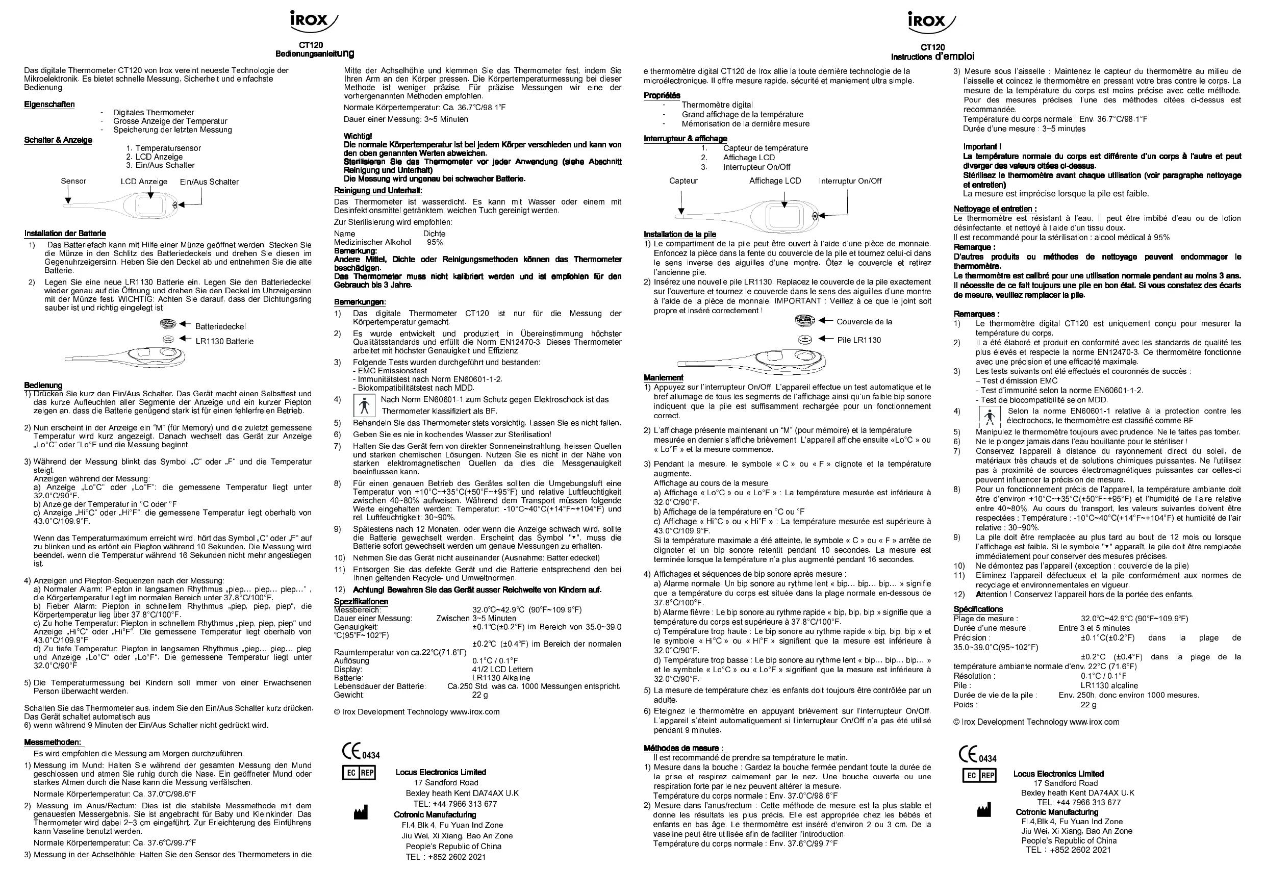 e thermomètre digital CT120 de Irox allie la toute dernière technologie de la microelectronique. Il offre mesure rapide, sécurité et maniement ultra simple.
