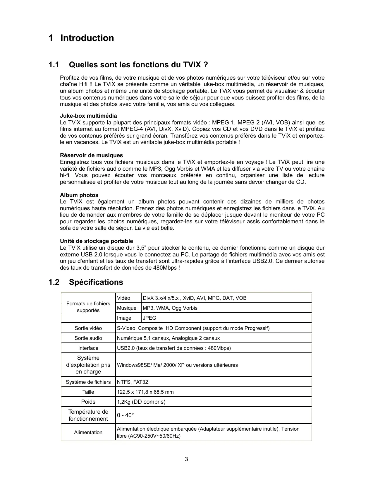 Quelles sont les fonctions du TViX ? Profitez de vos films, de votre musique et de vos photos numériques sur votre téléviseur et/ou sur votre chaîne Hifi !! Le TViX se présente comme un véritable juke-box multimédia, un réservoir de musiques, un album photos et même une unité de stockage portable. Le TViX vous permet de visualiser & écouter tous vos contenus numériques dans votre salle de séjour pour que vous puissez profiter des films, de la musique et des photos avec votre famille, vos amis ou vos collègues. Juke-box multimédia Le TViX supporte la plupart des principaux formats vidéo : MPEG-1, MPEG-2 (AVI, VOB) ainsi que les films internet au format MPEG-4 (AVI, DivX, XviD). Copiez vos CD et vos DVD dans le TViX et profitez de vos contenus préférés sur grand écran. Transférez vos contenus préférés dans le TViX et emportezle en vacances. Le TViX est un véritable juke-box multimédia portable ! Réservoir de musiques Enregistrez tous vos fichiers musicaux dans le TViX et emportez-le en voyage ! Le TViX peut lire une variété de fichiers audio comme le MP3, Ogg Vorbis et WMA et les diffuser via votre TV ou votre chaîne hi-fi. Vous pouvez écouter vos morceaux préférés en continu, organiser une liste de lecture personnalisée et profiter de votre musique tout au long de la journée sans devoir changer de CD. Album photos Le TViX est également un album photos pouvant contenir des dizaines de milliers de photos numériques haute résolution. Prenez des photos numériques et enregistrez les fichiers dans le TViX. Au lieu de demander aux membres de votre famille de se déplacer jusque devant le moniteur de votre PC pour regarder les photos numériques, regardez-les sur votre téléviseur assis confortablement dans le sofa de votre salle de séjour. La vie est belle. Unité de stockage portable Le TViX utilise un disque dur 3,5” pour stocker le contenu, ce dernier fonctionne comme un disque dur externe USB 2.0 lorsque vous le connectez au PC. Le partage de fichiers multimédia avec vos amis est un jeu d’enfant et les taux de transfert sont ultra-rapides grâce à l’interface USB2.0. Ce dernier autorise des taux de transfert de données de 480Mbps !