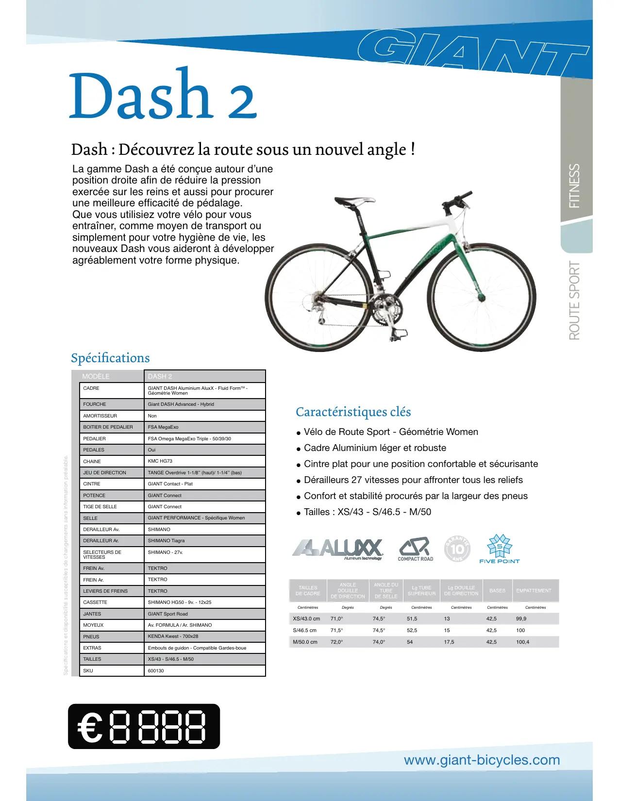 La gamme Dash a été conçue autour d'une position droite afin de réduire la pression exercée sur les reins et aussi pour procurer une meilleure efficacité de pédalage. Que you utilisez votre vélo pour vous entraîner, comme moyen de transport ou simplement pour votre hygiène de vie, les nouveaux Dash vous aideront à développer agréablement votre forme physique.