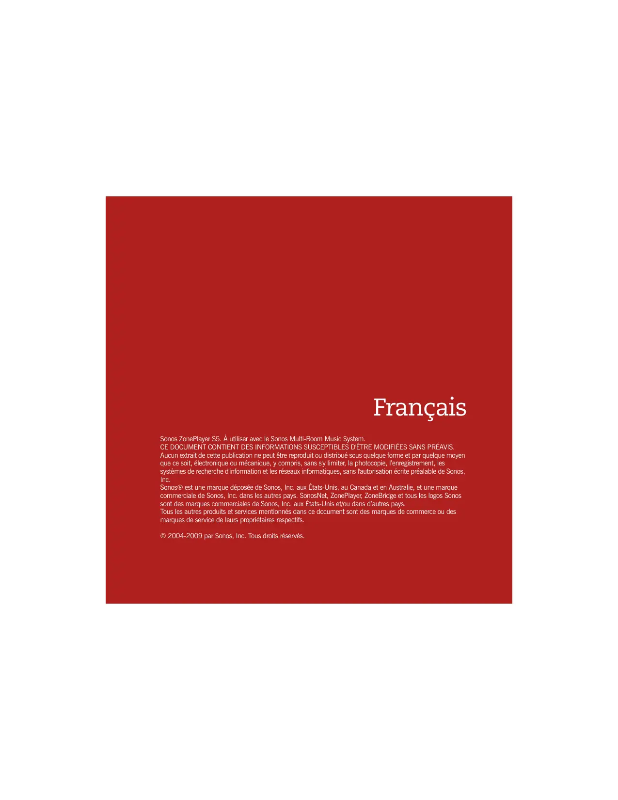 Français Sonos ZonePlayer S5. À utiliser avec le Sonos Multi-Room Music System. CE DOCUMENT CONTIENT DES INFORMATIONS SUSCEPTIBLES D'ÊTRE MODIFIÉES SANS PRÉAVIS. Aucun extrait de cette publication ne peut être reproduit ou distribué sous quelque forme et par quelque moyen que ce soit, électronique ou mécanique, y compris, sans s'y limiter, la photocopie, l’enregistrement, les systèmes de recherche d'information et les réseaux informatiques, sans l'autorisation écrite préalable de Sonos, Inc. Sonos® est une marque déposée de Sonos, Inc. aux États-Unis, au Canada et en Australie, et une marque commerciale de Sonos, Inc. dans les autres pays. SonosNet, ZonePlayer, ZoneBridge et tous les logos Sonos sont des marques commerciales de Sonos, Inc. aux États-Unis et/ou dans d’autres pays. Tous les autres produits et services mentionnés dans ce document sont des marques de commerce ou des marques de service de leurs propriétaires respectifs. © 2004-2009 par Sonos, Inc. Tous droits réservés. SVENSKA NEDERLANDS DEUTSCH FRANÇAIS
