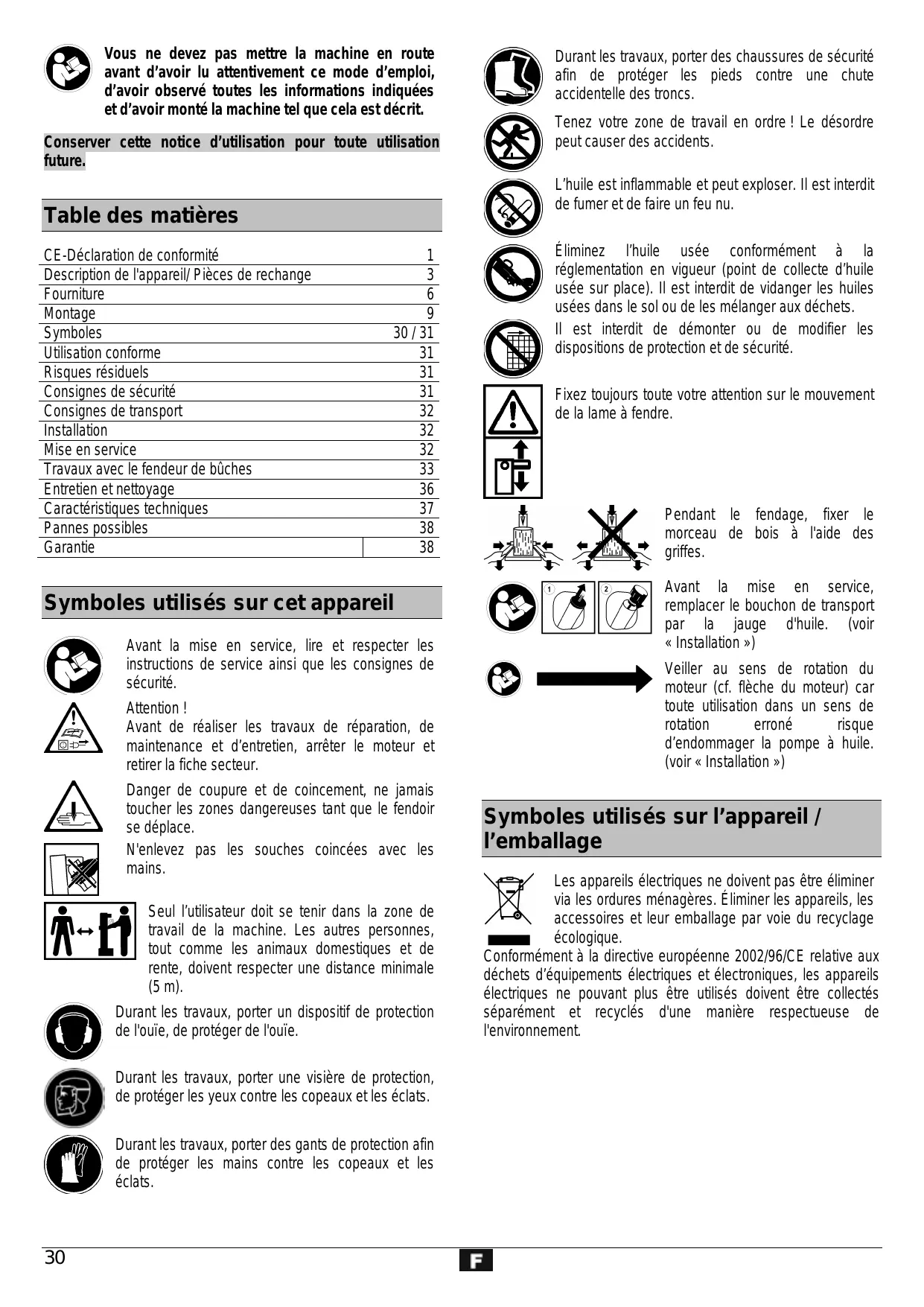 Vous ne devez pas mettre la machine en route (és avant d'avoir lu attentivement ce mode d'emploi, d’avoir observé toutes les informations indiquées et d'avoir monté la machine tel que cela est décrit. Conserver cette notice d'utilisation pour toute utilisation future. Table des matières Durant les travaux, porter des chaussures de sécurité afin de protéger les pieds contre une chute = accidentelle des troncs. Tenez votre zone de travail en ordre ! Le désordre peut causer des accidents. L'huile est inflammable et peut exploser. Il est interdit de fumer et de faire un feu nu. Éliminez l'huile usée conformément à la réglementation en vigueur (point de collecte d'huile usée sur place). Il est interdit de vidanger les huiles usées dans le sol ou de les mélanger aux déchets. Il est interdit de démonter ou de modifier les dispositions de protection et de sécurité. Fixez toujours toute votre attention sur le mouvement de la lame à fendre. CE-Déclaration de conformité 1 Description de l'appareil/ Pièces de rechange 3 Fourniture 6 Montage 9 Symboles 30/31 Utilisation conforme 31 Risques résiduels 31 Consignes de sécurité 31 Consignes de transport 32 Installation 32 Mise en service 32 Travaux avec le fendeur de büches 33 Entretien et nettoyage 36 Caractéristiques techniques 37 Pannes possibles 38 Garantie I 38 Symboles utilisés sur cet appareil Avant la mise en service, lire et respecter les instructions de service ainsi que les consignes de sécurité. Attention ! Avant de réaliser les travaux de réparation, de maintenance et d'entretien, arrêter le moteur et retirer la fiche secteur. Danger de coupure et de coincement, ne jamais
