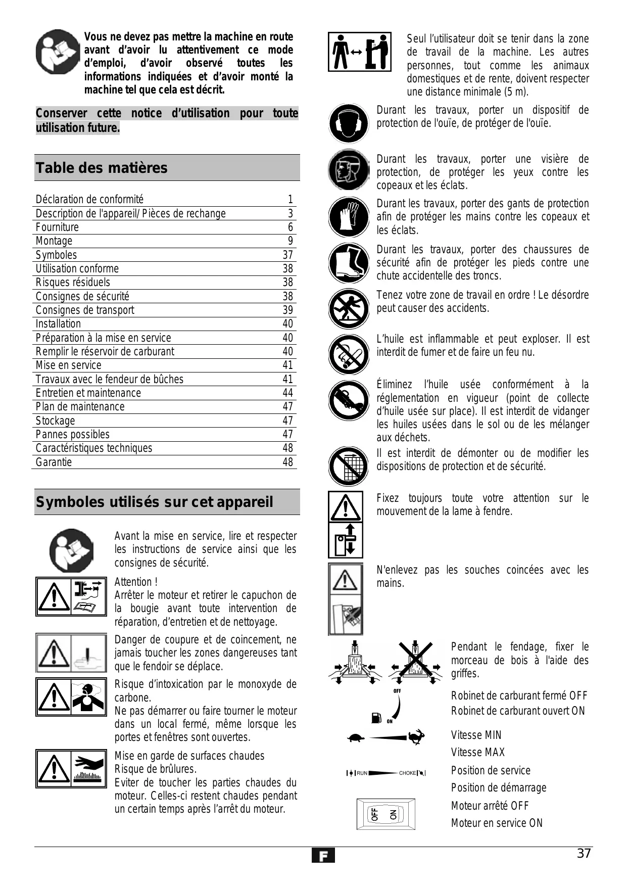 Symboles utilisés dans cette notices d'utilisation Danger imminent ou situation dangereuse. L'inobservation de ces indications peut entraîner des blessures ou des dégâts matériels. Indications importantes pour un emploi conforme à l'usage prévu. L'inobservation de ces indications peut provoquer des dysfonctionnements. & Indications pour l'usager. Ces indications sont d'une aide précieuse pour un emploi optimal des différentes fonctions. ra Montage, exploitation et maintenance. Ce symbole attire votre attention sur ce que vous devez faire. 1,12, N° de figure correspondant au texte. l'utilisateur soit inattentif, qu'il ne respecte pas les consignes de sécurité ou en cas d'emploi non conforme à l'usage prévu. “ Risque d'électrocution en touchant le capuchon de la bougie lorsque le moteur tourne. “ Risque de brûlures au contact avec les composants chauds. = Danger d'empoisonnement par le monoxyde de carbone en utilisant la machine dans un local fermé ou mal aéré. “ Endommagement de l'ouie en cas de travaux particulièrement longs sur là machine sans protection acoustique. Il se pourrait donc que des risques résiduels non apparents persistent bien que toutes les mesures de protection aient été prises. Consignes de sécurité Utilisation conforme "Le fendeur de bûches convient uniquement pour fendre le bois. Seul le bois découpé convient pour le fendeur de bûches. Éliminer impérativement les corps étrangers (clous, fils de fer, béton etc.) du bois à fendre. =“ Un emploi conforme à l'usage prévu implique notamment aussi l'observation des instructions de service, de maintenance et de réparation du fabricant et le respect des consignes de sécurité contenues dans ces instructions. “Toute utilisation divergente de la machine est considérée comme emploi non conforme à l'usage prévu. Le fabricant décline toute responsabilité pour les dommages en résultant : le risque incombe exclusivement à l'usager. "La machine ne doit être utilisé, entretenu et ajusté que par des personnes connaissant l'appareil et averties des risques qui y sont liés. Les réparations demeurent strictement réservées à notre SAV ou à un service après- vente nommé par nos soins. Risques résiduels À Même un emploi conforme à l'usage prévu et le respect des consignes de sécurité applicables en la matière ne sauraient exclure tous les risques résiduels générés par la construction et l'emploi de la machine, notamment. Les risques résiduels peuvent être minimisés en respectant les « consignes de sécurité » et une « utilisation conforme » ainsi que toutes les indications de cette notice d'utilisation. La prise de précautions et la prudence réduisent les risques de blessures corporelles et d'endommagements. = Les mesures de sécurité ignorées ou omises peuvent occasionner des blessures ou des endommagements. =" Le fendeur en déplacement risque de causer des blessures aux mains ou aux doigts pour autant que Avant toute mise en service de ce produit, lire et respecter les indications suivantes et les règlements de prévention d'accident de l'association préventive des accidents du travail, particulièrement les consignes de sécurité en vigueur dans les pays respectifs afin d'éviter tout risque d'accident sur vous et les autres. © Remettez les consignes de sécurité à toutes les personnes devant travailler avec la machine. © Conservez ces consignes de sécurité en lieu sûr. “Soyez attentif. Veillez à ce que vous faites. Travaillez de façon raisonnable. N'utilisez pas l'équipement si vous êtes fatigué ou sous l'emprise de drogues, d'alcool ou de médicaments. La moindre inattention pendant l'utilisation de l'équipement peut provoquer de graves blessures. “Avant utilisation, familiarisez-vous avec l'appareil à l'aide de la notice d'utilisation. “Ne pas utiliser l'appareil à des fins non appropriées (voir «Utilisation conforme » et « Travaux avec le fendeur de bûches » ). =“ Prenez correctement appui sur vos jambes et veillez à conserver un bon équilibre. “Veuillez adopter une position de travail située dans la zone des poignées de commande. “Ne vous tenez jamais debout sur la machine. = Lors des travaux, portez — une visière de protection — un dispositif de protection de l'ouie — des gants de travail — des chaussures de sécurité munies d'un revêtement en acier. =“ Portez des vêtements de travail appropriés : — pas de vêtements amples ni de bijoux (ils pourraient être happés par les pièces en mouvement) “L'utilisateur est responsable de la machine à l'égard de tiers dans la zone de travail. “Iles interdit aux enfants et aux adolescents de moins de 18 ans d'utiliser la machine. “_ Maintenez les enfants à distance de l'appareil.