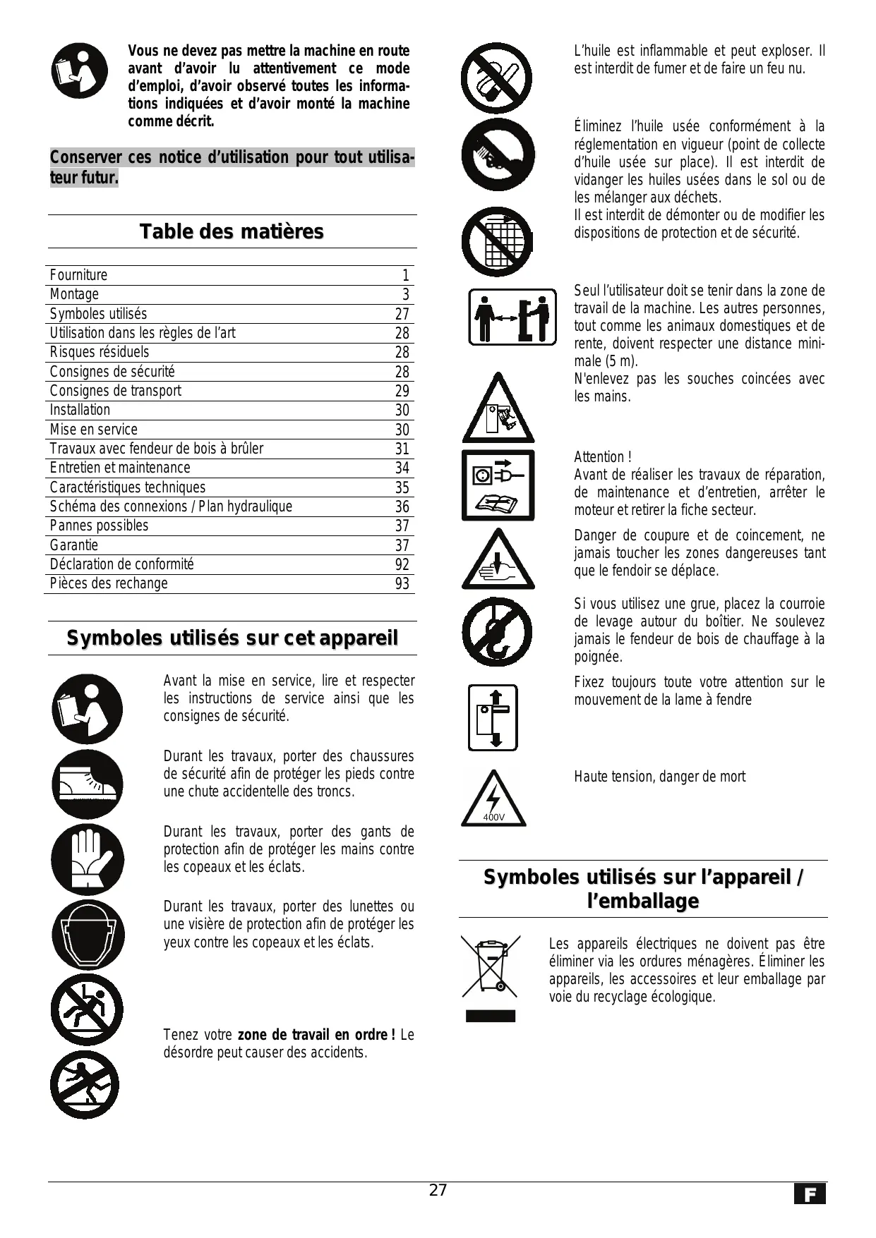 ⇒ Check the fuse. ⇒ Have fuse and lead checked by qualified electrician. ⇒ Replace the connection cable or have it checked by an electrician. ⇒ To correct the problem, refer to the manufacturer or other approved service centre. Vous ne devez pas mettre la machine en route avant d’avoir lu attentivement ce mode d’emploi, d’avoir observé toutes les informations indiquées et d’avoir monté la machine comme décrit. L’huile est inflammable et peut exploser. Il est interdit de fumer et de faire un feu nu. Éliminez l’huile usée conformément à la réglementation en vigueur (point de collecte d’huile usée sur place). Il est interdit de vidanger les huiles usées dans le sol ou de les mélanger aux déchets. Il est interdit de démonter ou de modifier les dispositions de protection et de sécurité. Conserver ces notice d’utilisation pour tout utilisateur futur. Table des matières Fourniture Montage Symboles utilisés Utilisation dans les règles de l’art Risques résiduels Consignes de sécurité Consignes de transport Installation Mise en service Travaux avec fendeur de bois à brûler Entretien et maintenance Caractéristiques techniques Schéma des connexions / Plan hydraulique Pannes possibles Garantie Déclaration de conformité Pièces des rechange