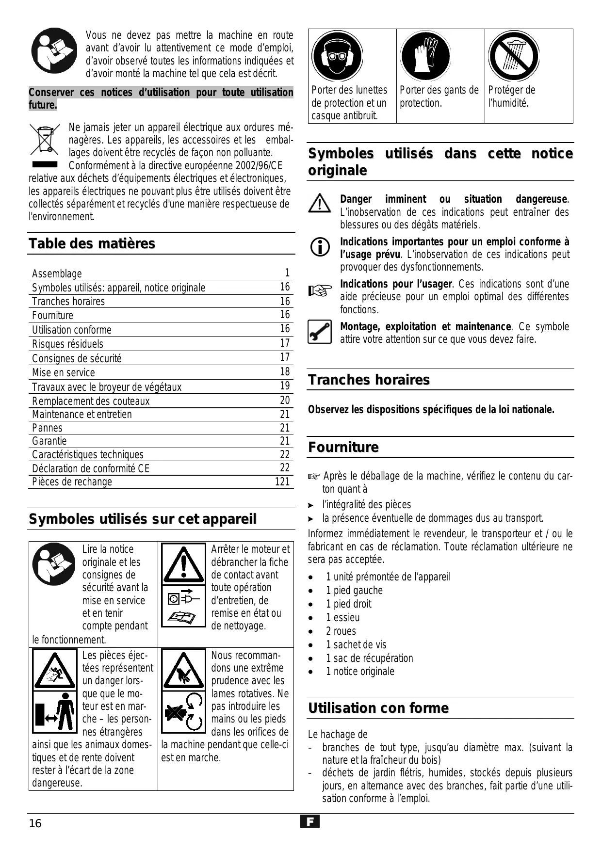 | Symboles utilisés: apparéil, notice originale | 16 |