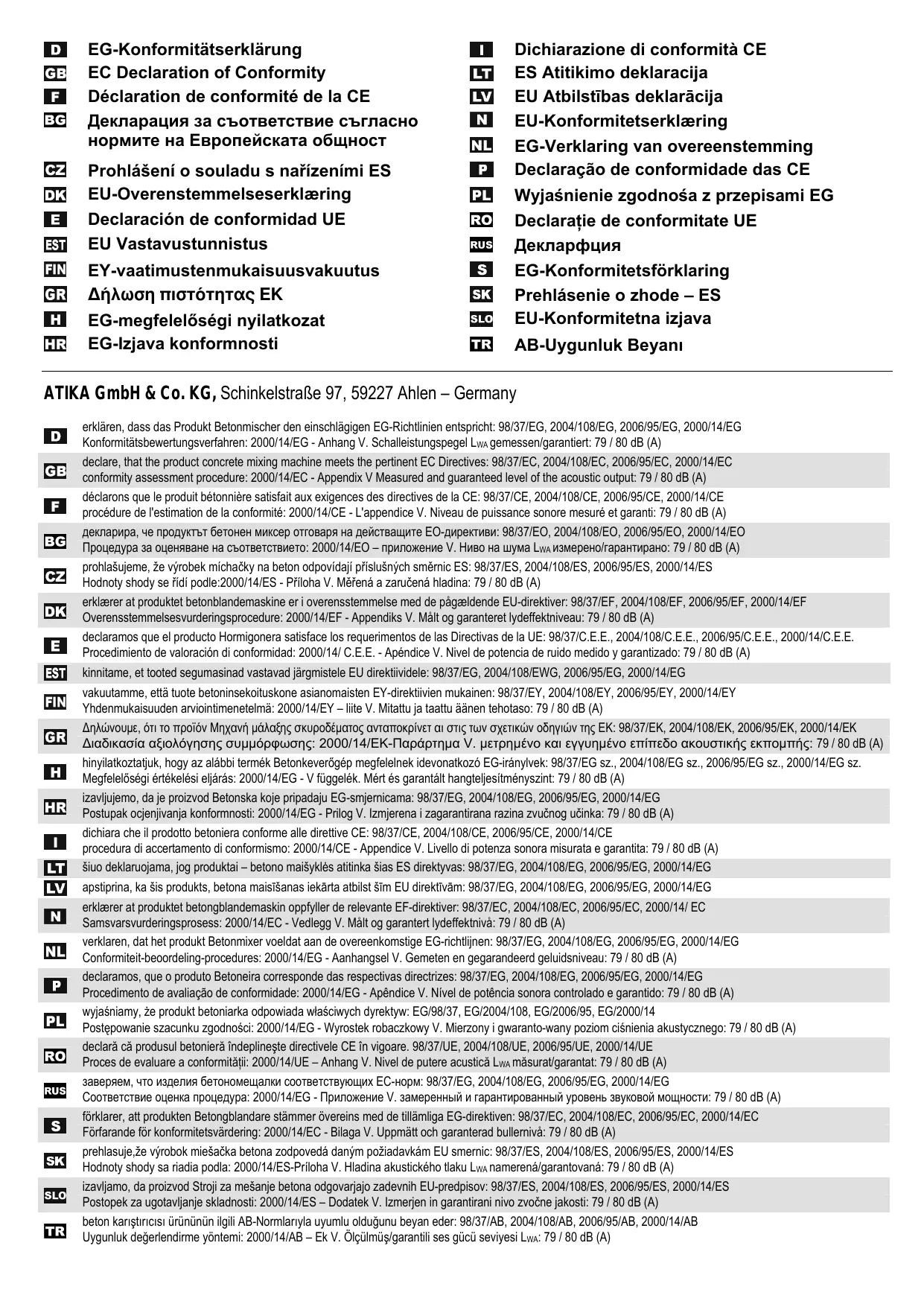 | Normes respectées | 98/37/CE, 2004/108/CE, 2006/95/CE, 2000/14/EG |