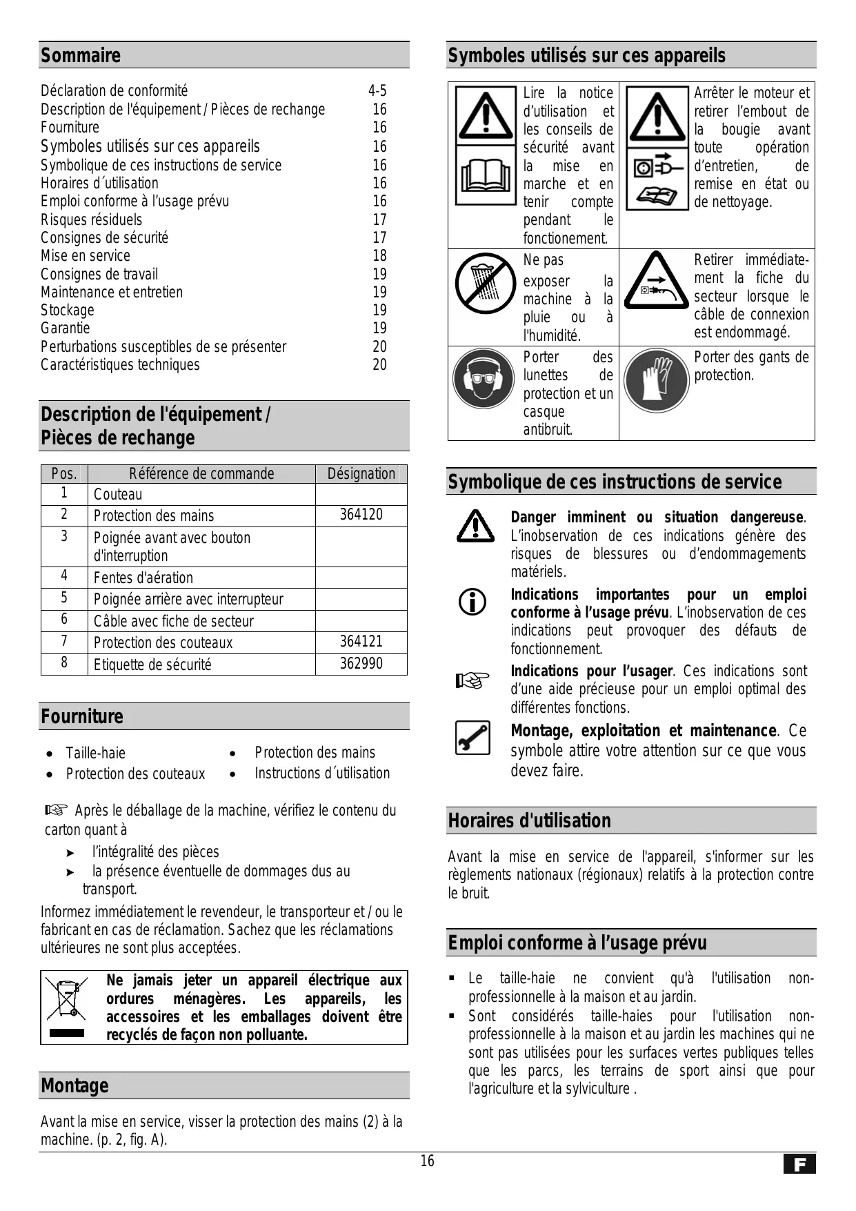 La machine ne doit pas être utilisée pour la taille de gazons, la coupure des bordures de gazons ou le broyage de matières compostables. Risque de blessures ! Un emploi conforme à l’usage prévu implique notamment aussi l’observation des instructions de service, de maintenance et de réparation du fabricant et le respect des consignes de sécurité contenues dans ces instructions. Les prescriptions de prévention des accidents applicables au site d’exploitation ainsi que les dispositions de médecine du travail et de sécurité technique générales sont à respecter. Toute utilisation divergente de la machine est considérée comme emploi non conforme à l’usage prévu. Le fabricant décline toute responsabilité pour les dommages en résultant : le risque incombe exclusivement à l’usager. Le constructeur décline toute responsabilité en cas de dommages provoqués par une modification non-conforme du taille-haie. Le taille-haie ne doit être ajusté, utilisé et entretenu que par des personnes familiarisées avec la machine et les dangers. Les réparations demeurent strictement réservées à notre SAV ou à un service après-vente nommé par nos soins. Une utilisation de la machine en environnement explosif et son exposition à la pluie sont interdites. Enlever impérativement toute pièce métallique (fils etc.) de la haie à tailler.