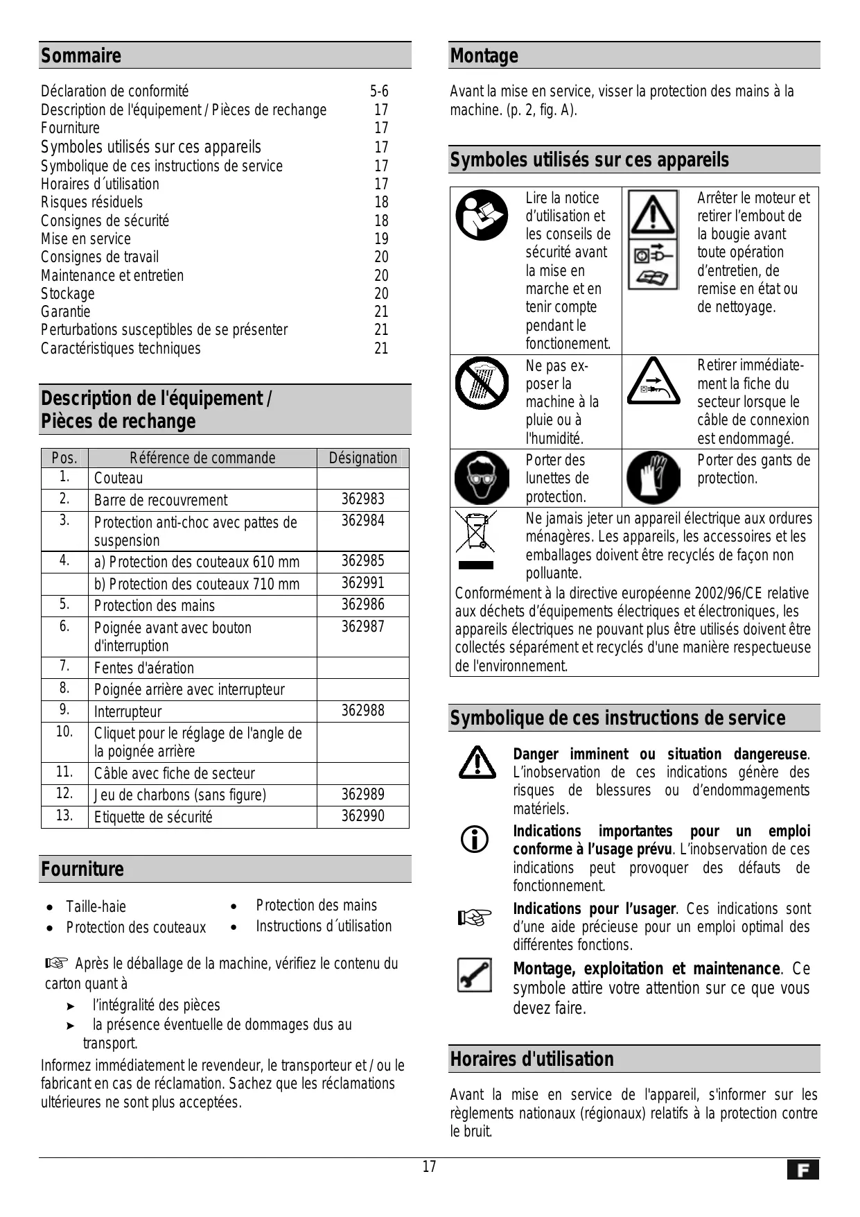 Mise en service 19 les conseils de la bougie avant Consignes de travail 20 sécurité avant ||[f@j5-| toute opération Maintenance et entretien 20 là mise en | d'entretien, de Stockage 20 marche eten remise en état ou Garantie 21 tenir compte de nettoyage. Perturbations susceptibles de se présenter 21 pendant le Caractéristiques techniques 21 fonctionement. Ne pas ex- Retirer immédiate- = = poser la ment la fiche du Description de l'équipement / © machine à la secteur lorsque le Pièces de rechange pluie ou à câble de connexion l'humidité. est endommagé. Pos. Référence de commande Désignation Porter des Porter des gants de 1. | Couteau Q lunettes de protection. 2. | Barre de recouvrement 362983 protection. 3. | Protection anti-choc avec pattes de 362984 Ne jamais jeter un appareil électrique aux ordures suspension ménagères. Les appareils, les accessoires et les 4. |) Protection des couteaux 610 mm 362985 mms Smelages doivent être recyclés de façon non b) Protection des couteaux 710 mm 362991 A polluante. ; A ; = Conformément à la directive européenne 2002/96/CE relative 5: _ | Protection des mains 362986 aux déchets d'équipements électriques et électroniques, les 6. | Poignée avant avec bouton 362987 appareils électriques ne pouvant plus être utilisés doivent être d'interruption collectés séparément et recyclés d'une manière respectueuse 7. | Fentes d'aération de l'environnement. 8 | Poignée arrière avec interrupteur 9] Interrupteur 362988 Symbolique de ces instructions de service 10. | Cliquet pour le réglage de l'angle de la poignée arrière À Danger imminent ou situation dangereuse. 11. | Câble avec fiche de secteur L'inobservation de ces indications génère des 12. | jeu de charbons (sans figure] 362989 risques de blessures ou d'endommagements 13. | Etiquette de sécurité 362990 matériels. Indications importantes pour un emploi conforme à l’usage prévu. L'inobservation de ces Fourniture indications peut provoquer des défauts de fonctionnement. e Taille-haie + Protection des mains