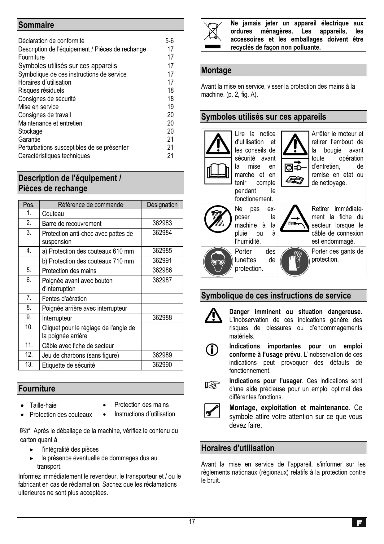 Ne jamais jeter un appareil électrique aux ordures ménagères. Les appareils, les accessoires et les emballages doivent être recyclés de façon non polluante. Sommaire Déclaration de conformité Description de l'équipement / Pièces de rechange Fourniture Symboles utilisés sur ces appareils Symbolique de ces instructions de service Horaires d´utilisation Risques résiduels Consignes de sécurité Mise en service Consignes de travail Maintenance et entretien Stockage Garantie Perturbations susceptibles de se présenter Caractéristiques techniques 5-6