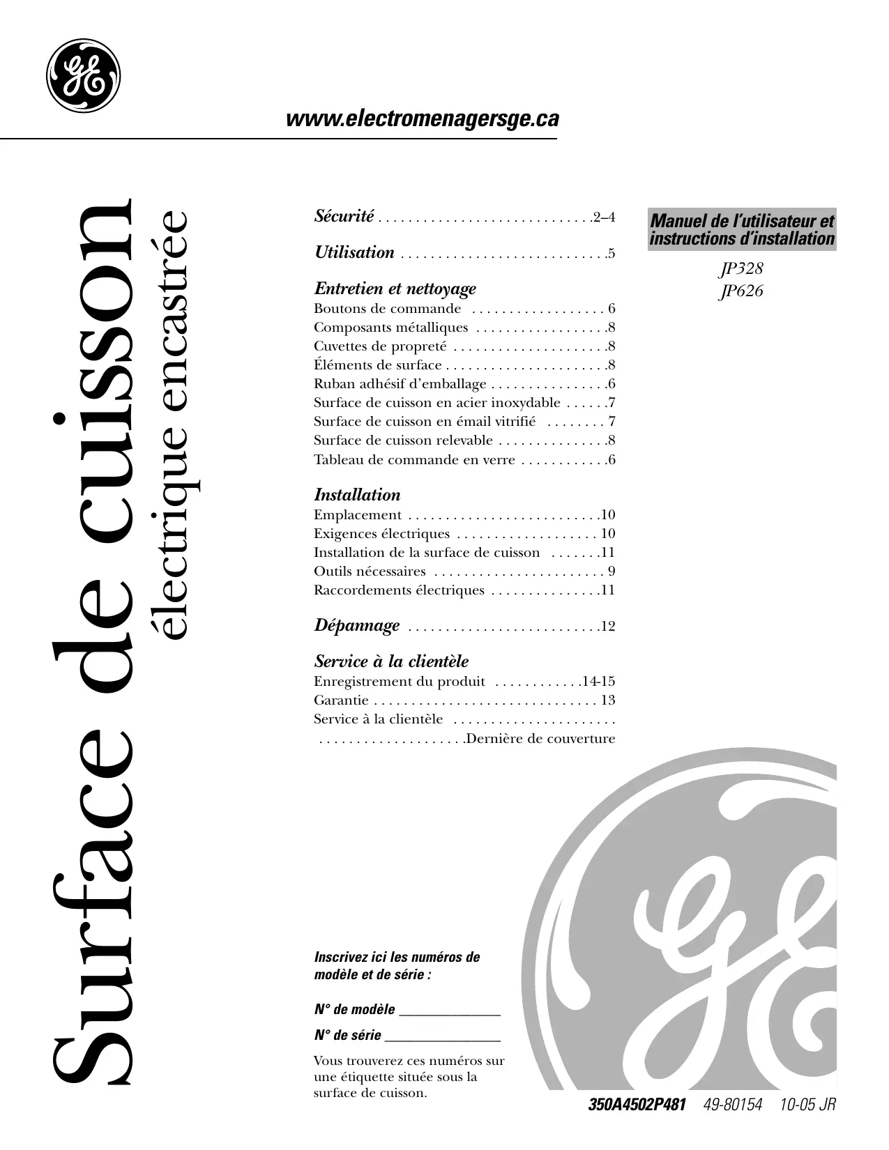 www.electromenagersge.ca trique encastrée lectri Surface de cuisson | $ Utilisation ............................5 Entretien et nettoyage Boutons de commande . Composants métalliques Cuvettes de propreté ..................... Éléments de surface . Ruban adhésif d'emballage ................ 6 Surface de cuisson en a inoxydable ...... 7 Surface de cuisson en émail vitrifié Surface de cuisson relevable Installation Emplacement .......................... 10 Exigences électriques ...... ...10 Installation de la surface de « Outils nécess Raccordements électrique Dépannage .......................... 12 Service à la clientèle Enregistrement du produit ............ 14-15 Garanti 13 Inscrivez ici les numéros de modèle et de série : N° de modèle N° de série Vous trouverez ces numéros sur une étiquette située sous la surface de cuisson. Manuel de l'utilisateur et instructions d'installation JP328 JP626 350A4502P481 49-80154 10-05 JR
