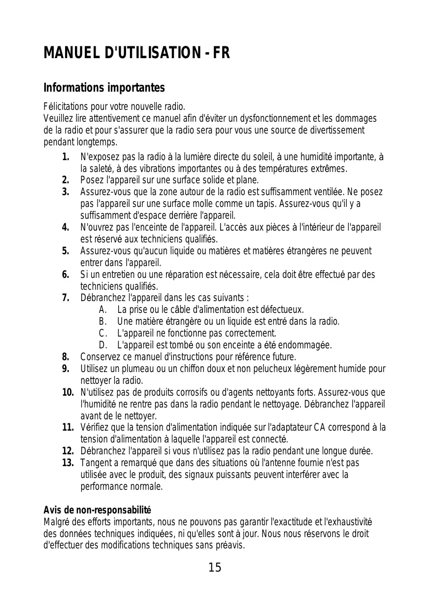 12. Débranchez l'appareil si vous n'utilisez pas la radio pendant une longue durée.