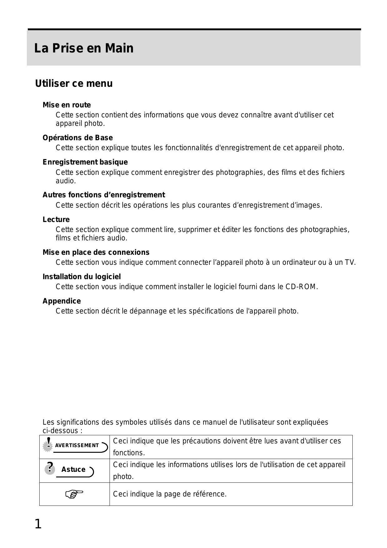Les significations des symboles utilisés dans ce manuel de l'utilisateur sont expliquées ci-dessous :