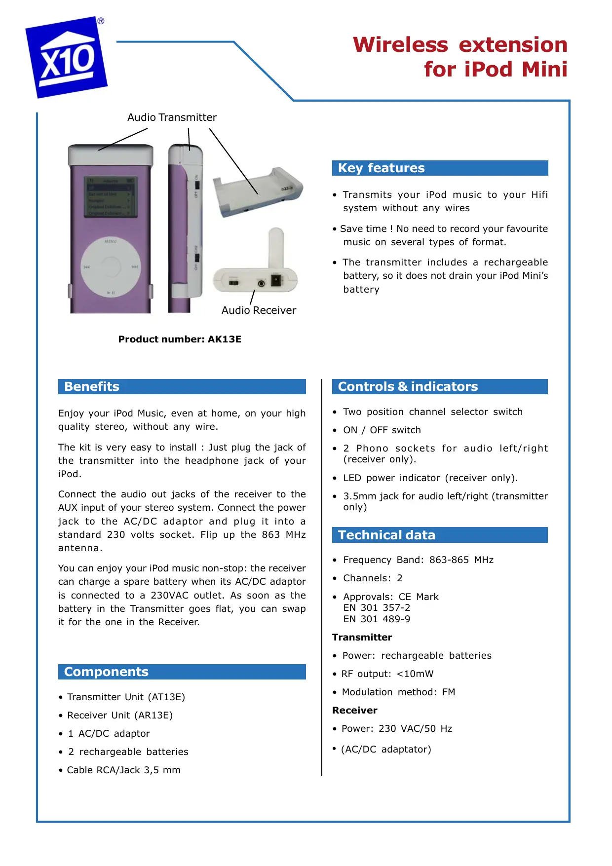 AK13E - Émetteur-récepteur audio sans fil X10 - Notice d'utilisation et mode d'emploi gratuit