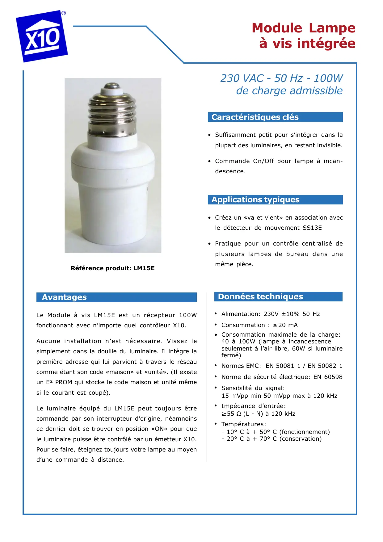 Le Module à vis LM15E est un récepteur 100W fonctionnant avec n'importe quel contrôle X10.