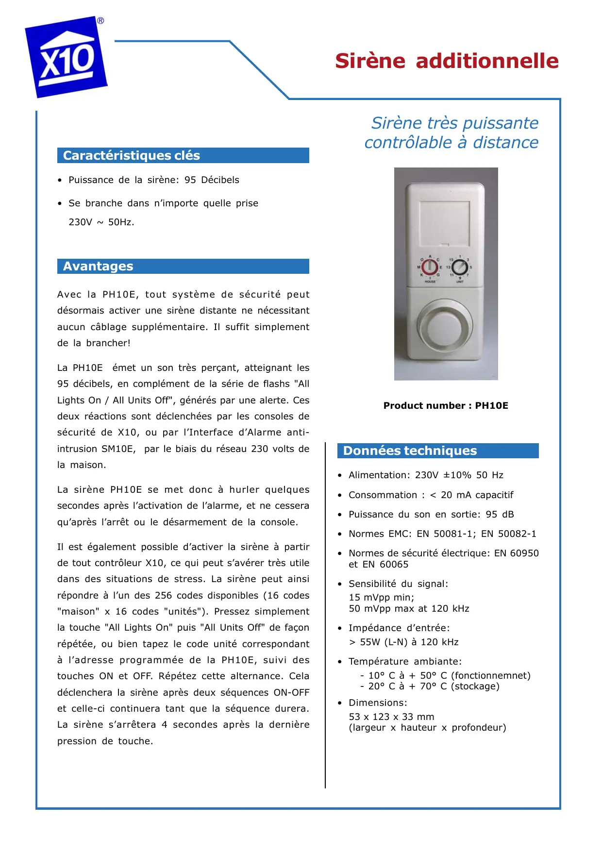 La PH10E émet un son très précant, atteignant les 95 décibels, en complément de la série de flashes "All Lights On / All Units Off", généres par une alerte. Ces deux réactions sont déclenchées par les consoles de sécurité de X10, ou par l'Interface d'Alarme anti-intrusion SM10E, par le biais du réseau 230 volts de la maison.